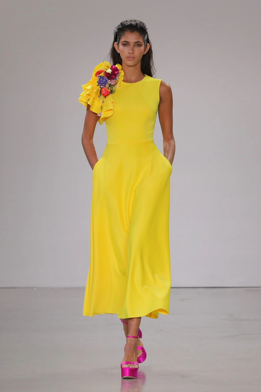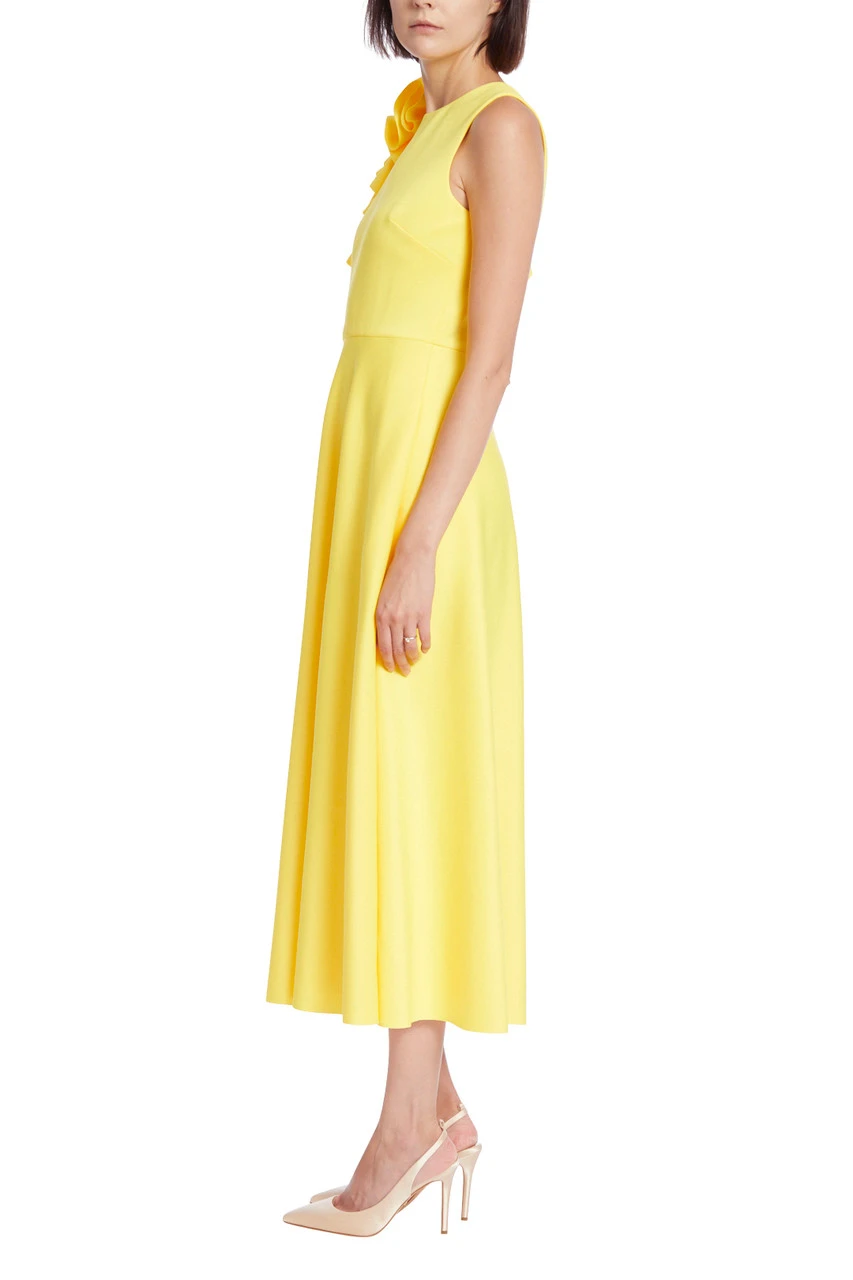 This dress has a fitted, sleeveless bodice has been paired with a large ruffle fabric detail that adds flair to this stunning look. The full skirt below completes the elegant ensemble, while the lightweight stretch scuba material ensures comfort on those spring nights.