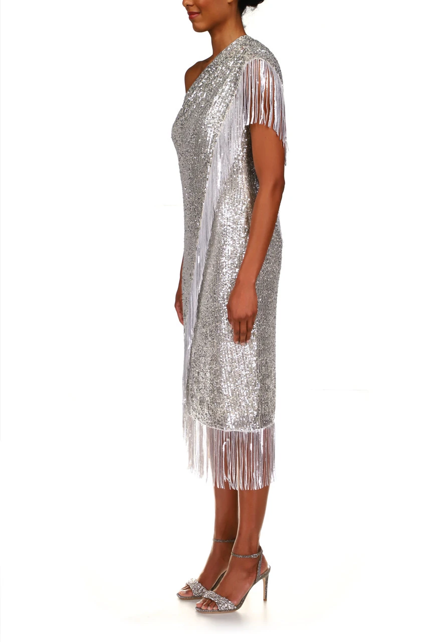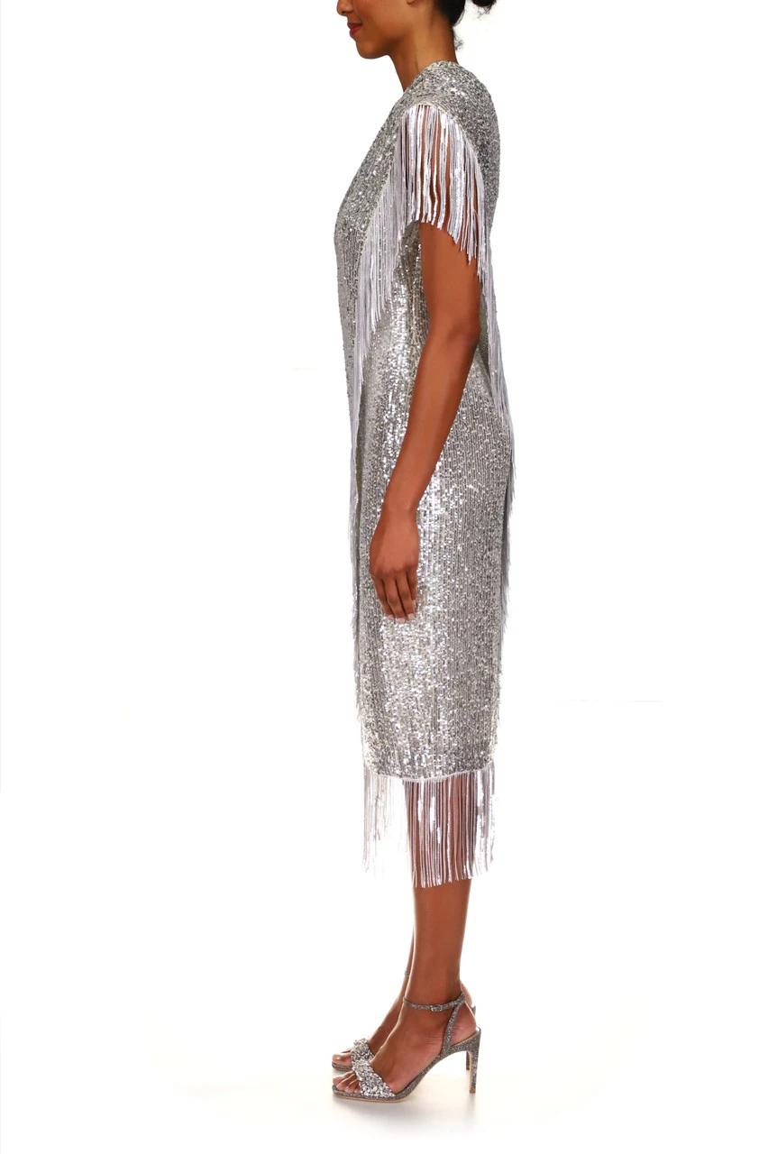Reminiscent of the 1920s flapper style, this silver fringed cocktail dress is uniquely designed for today’s timeless, fashion-forward woman. Step out with sparkle and flair.
