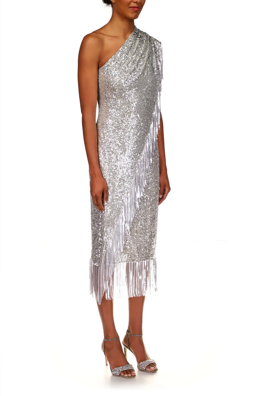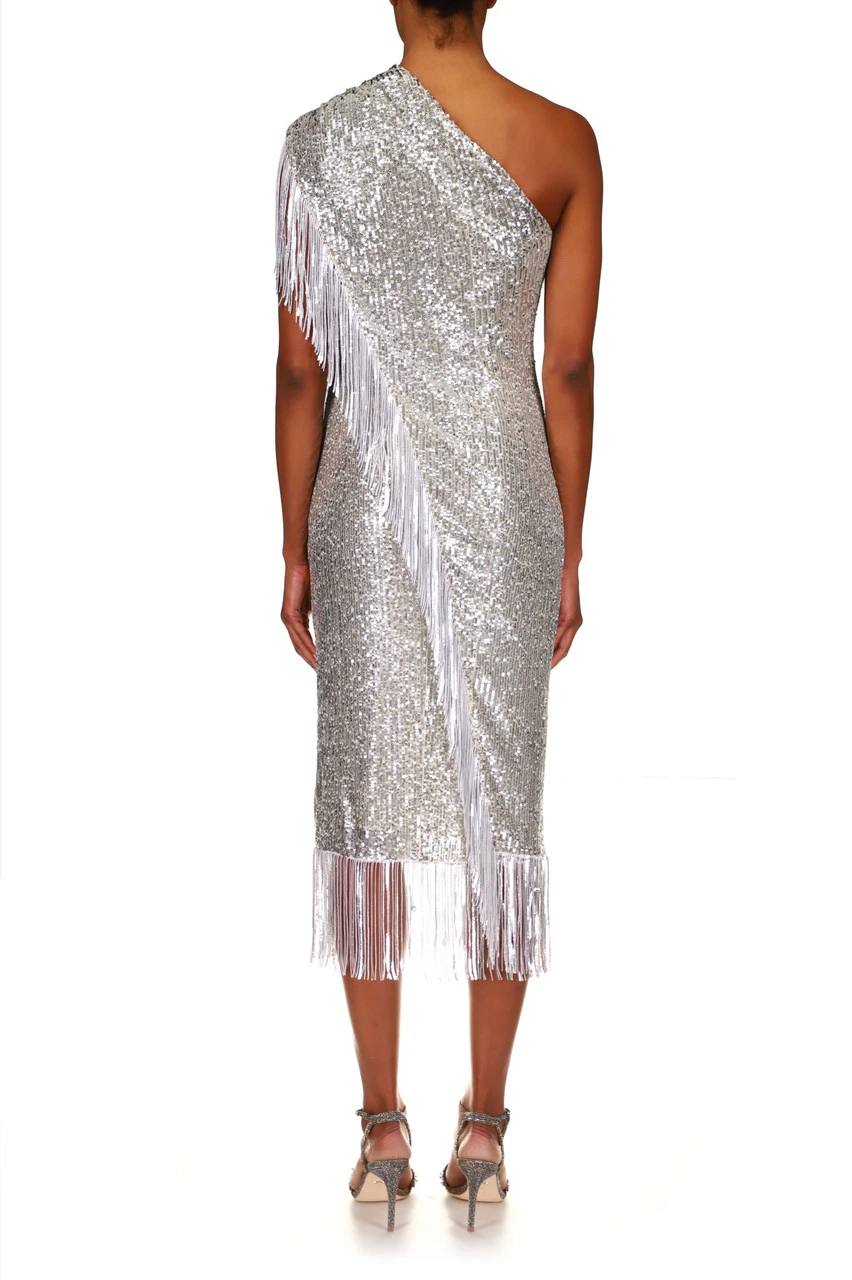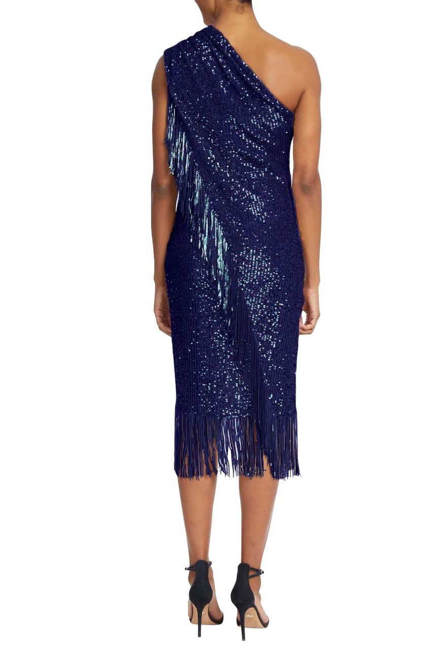 A fringed hem creates cohesion throughout this piece, running from the top of the shoulder, to the hem, and around the bottom of your skirt. This fitted dress highlights your figure and elegantly reveals a single shoulder. There’s no doubt you’ll look marvelous in this fitted sequin dress designed to turn heads; the diamond in your wardrobe.