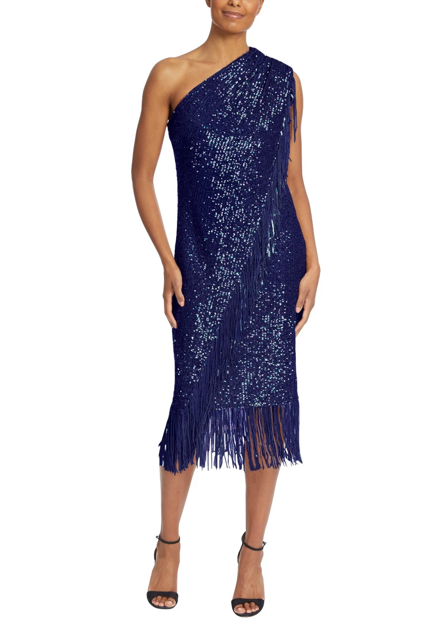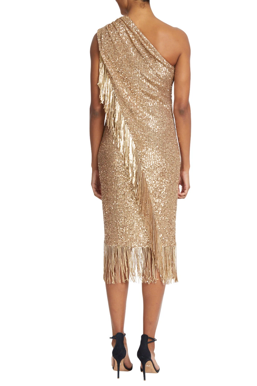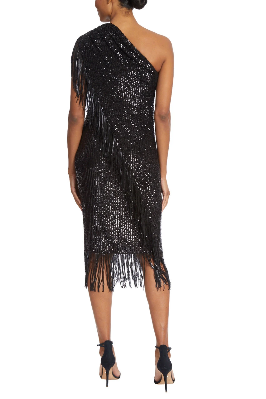 A fringed hem creates cohesion throughout this piece, running from the top of the shoulder, to the hem, and around the bottom of your skirt. This fitted dress highlights your figure and elegantly reveals a single shoulder. There’s no doubt you’ll look marvelous in this fitted sequin dress designed to turn heads; the diamond in your wardrobe.