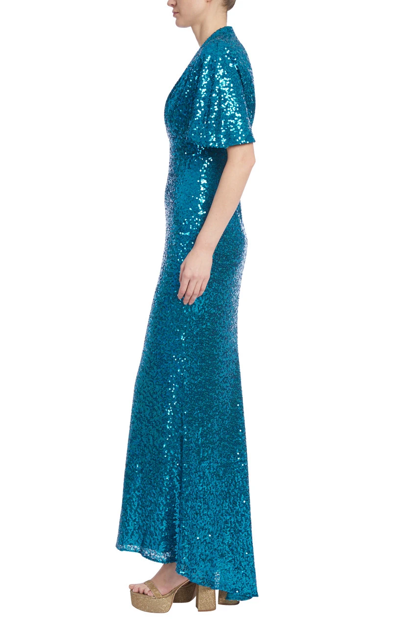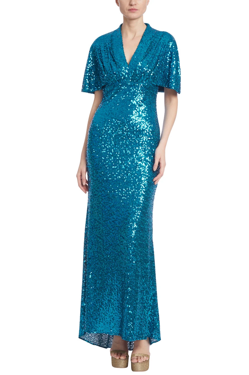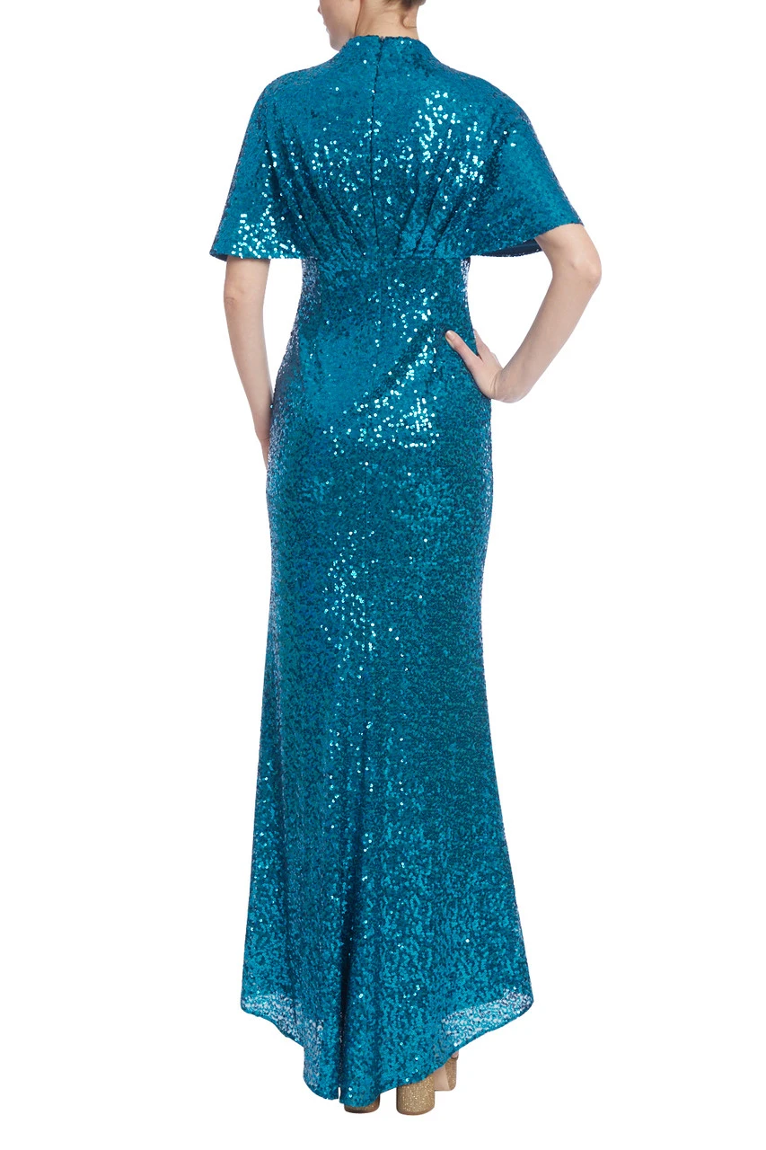 This evening gown has all the right details: sparkling sequins, elegant short dolman sleeves, and a column silhouette to highlight your curves to perfection. Add just the right amount of romance with a V-neckline and pleated bodice, and you’ve got yourself a jaw-dropping gown that will make any event unforgettable.
