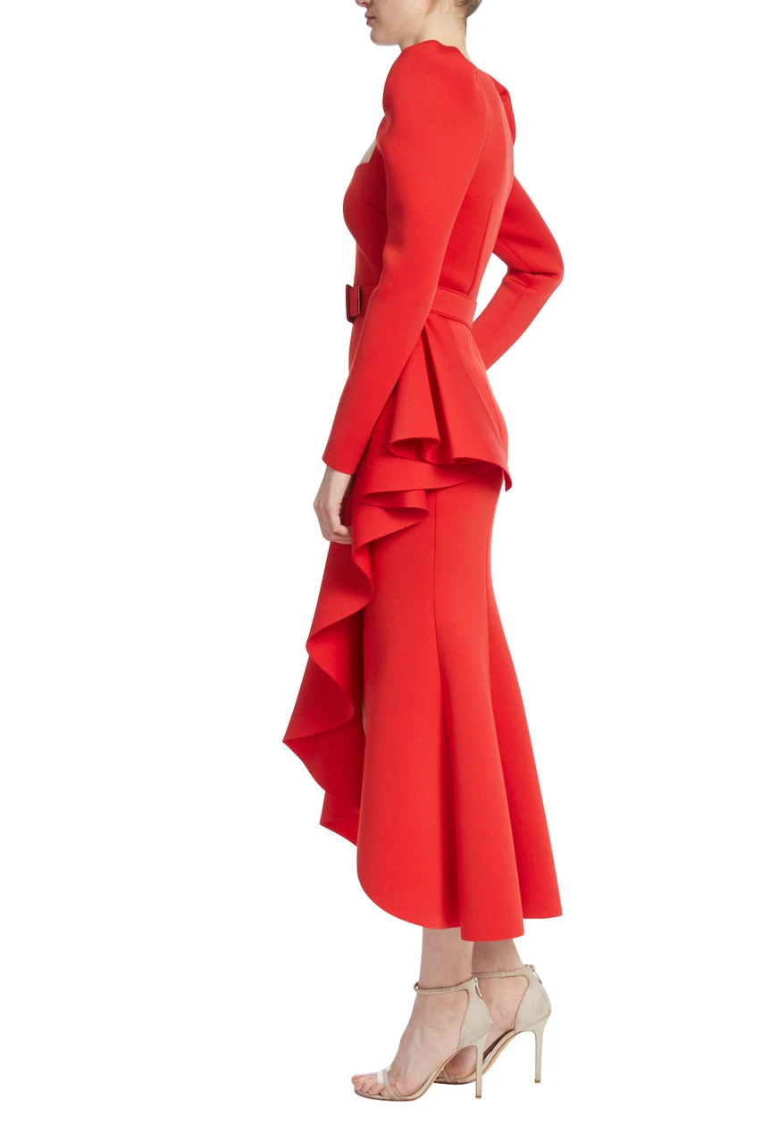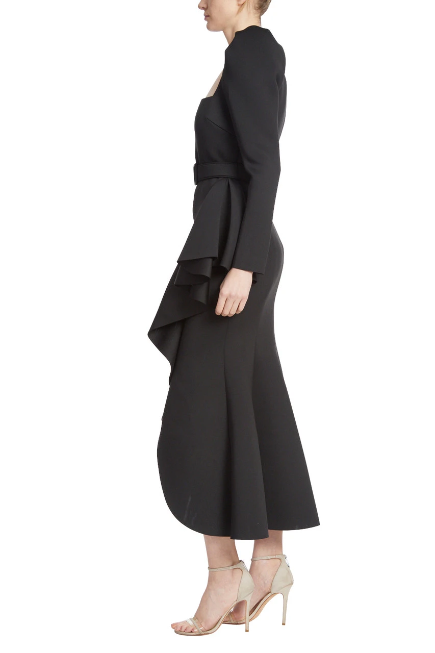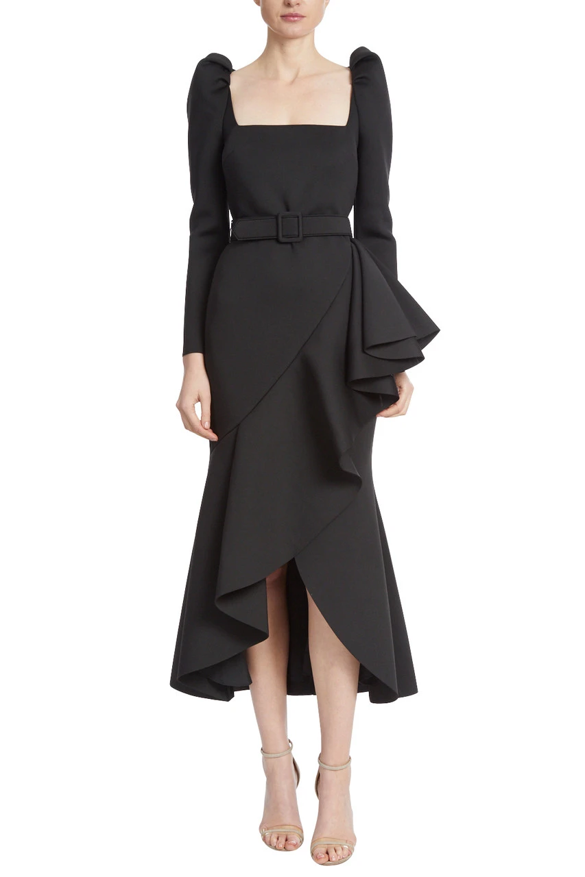 Long, puffed sleeves set the tone for this outfit and add grace to your arms, while the belt highlights your curves. The asymmetrical ruffles cascading from the hip to the calves make for a free-spirited, playful, powerful fashion statement.