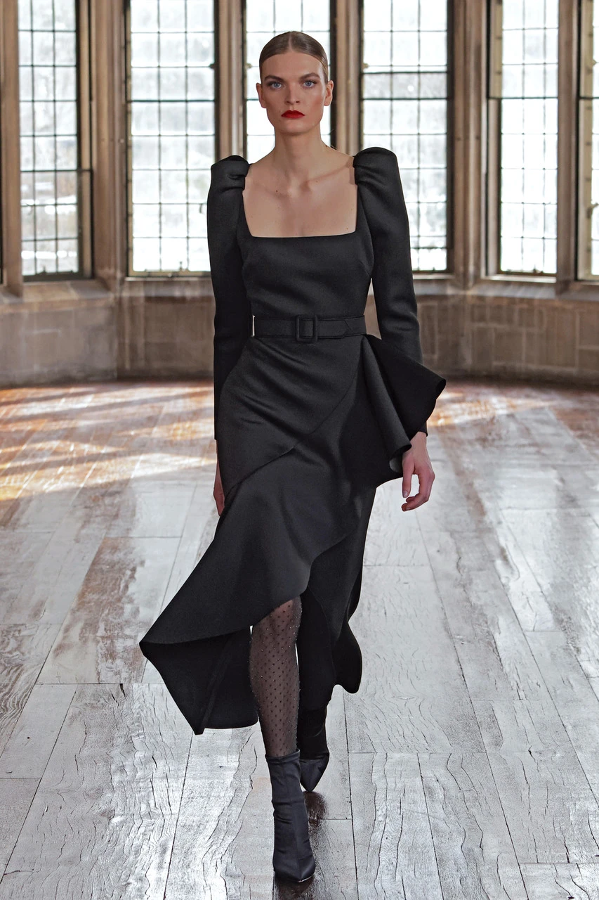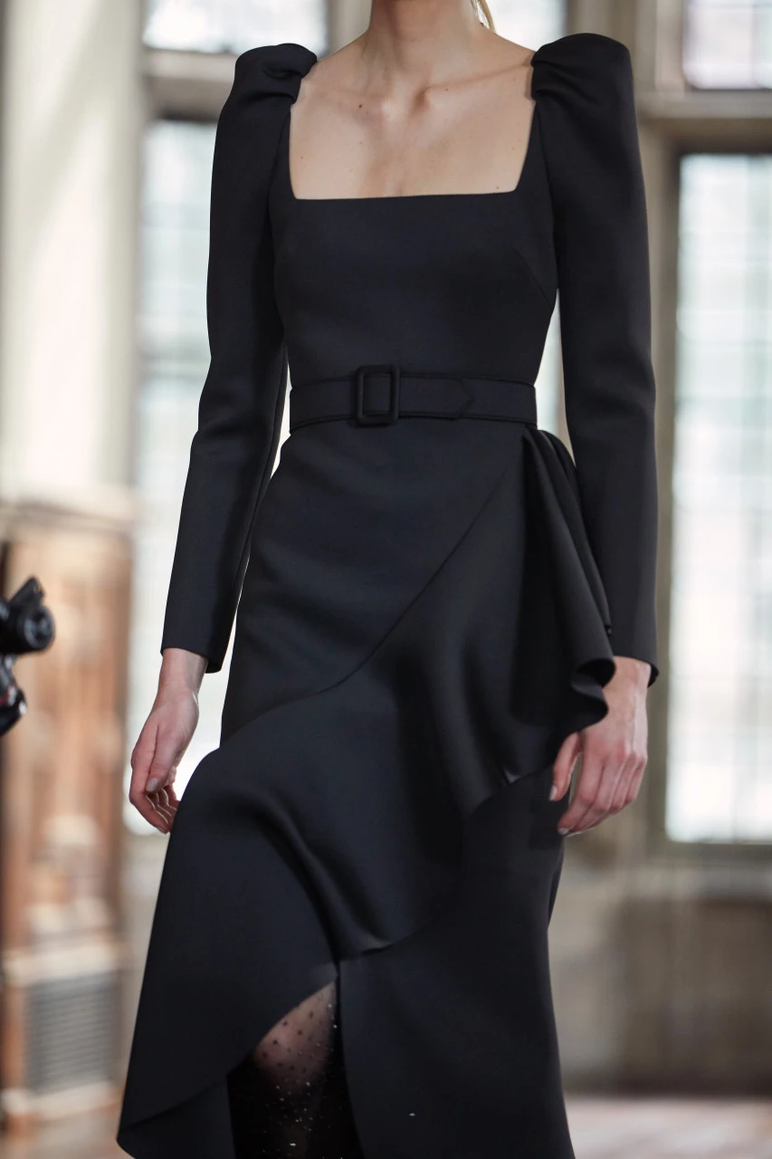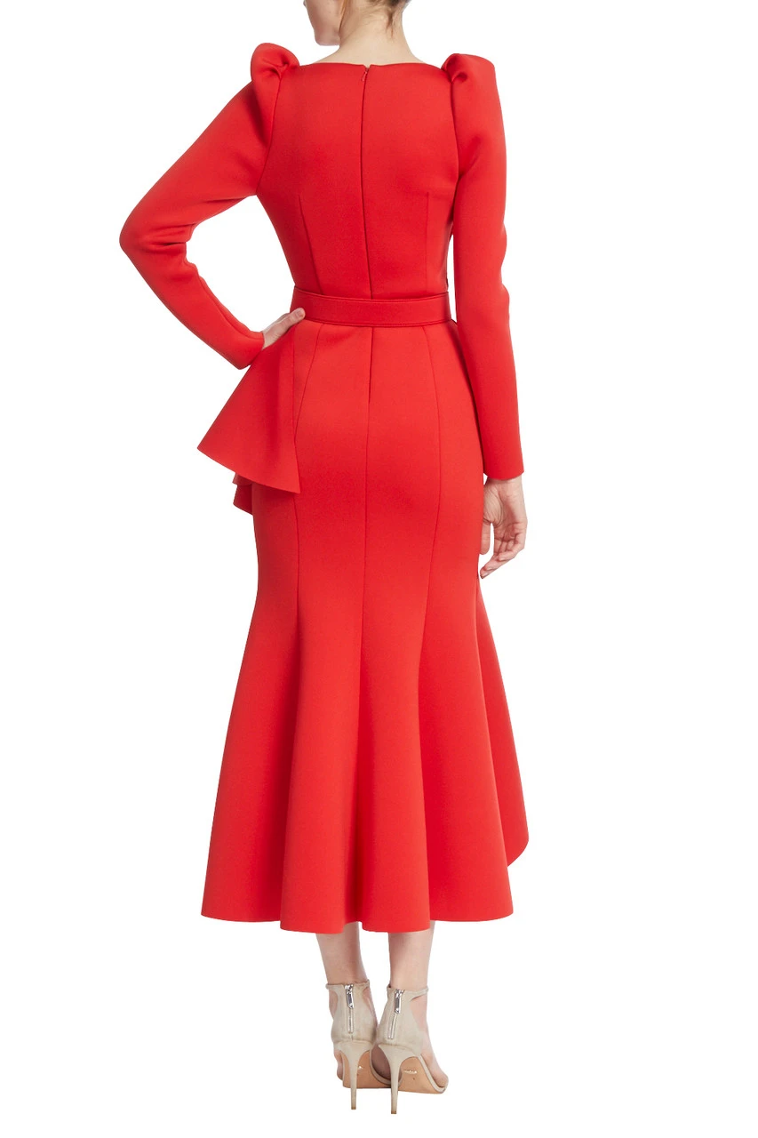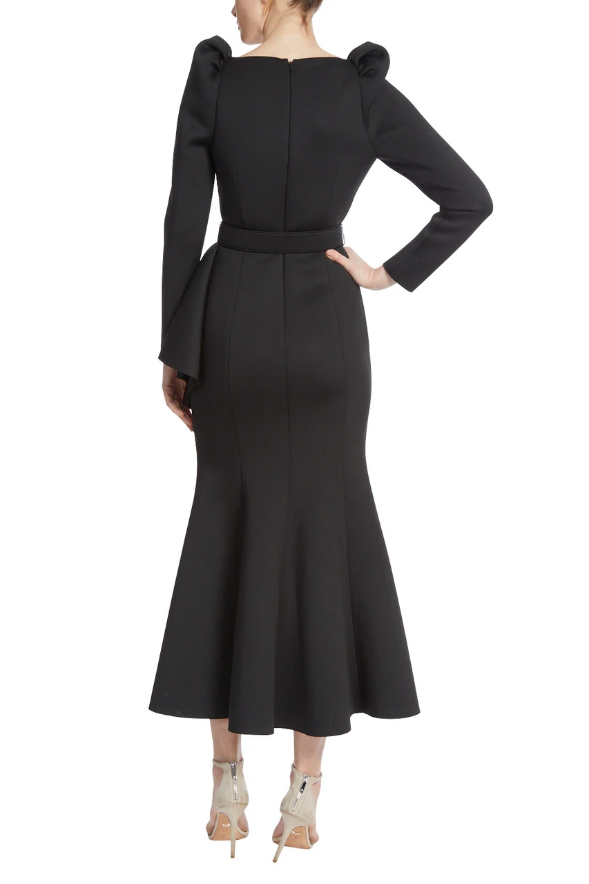 Long, puffed sleeves set the tone for this outfit and add grace to your arms, while the belt highlights your curves. The asymmetrical ruffles cascading from the hip to the calves make for a free-spirited, playful, powerful fashion statement.