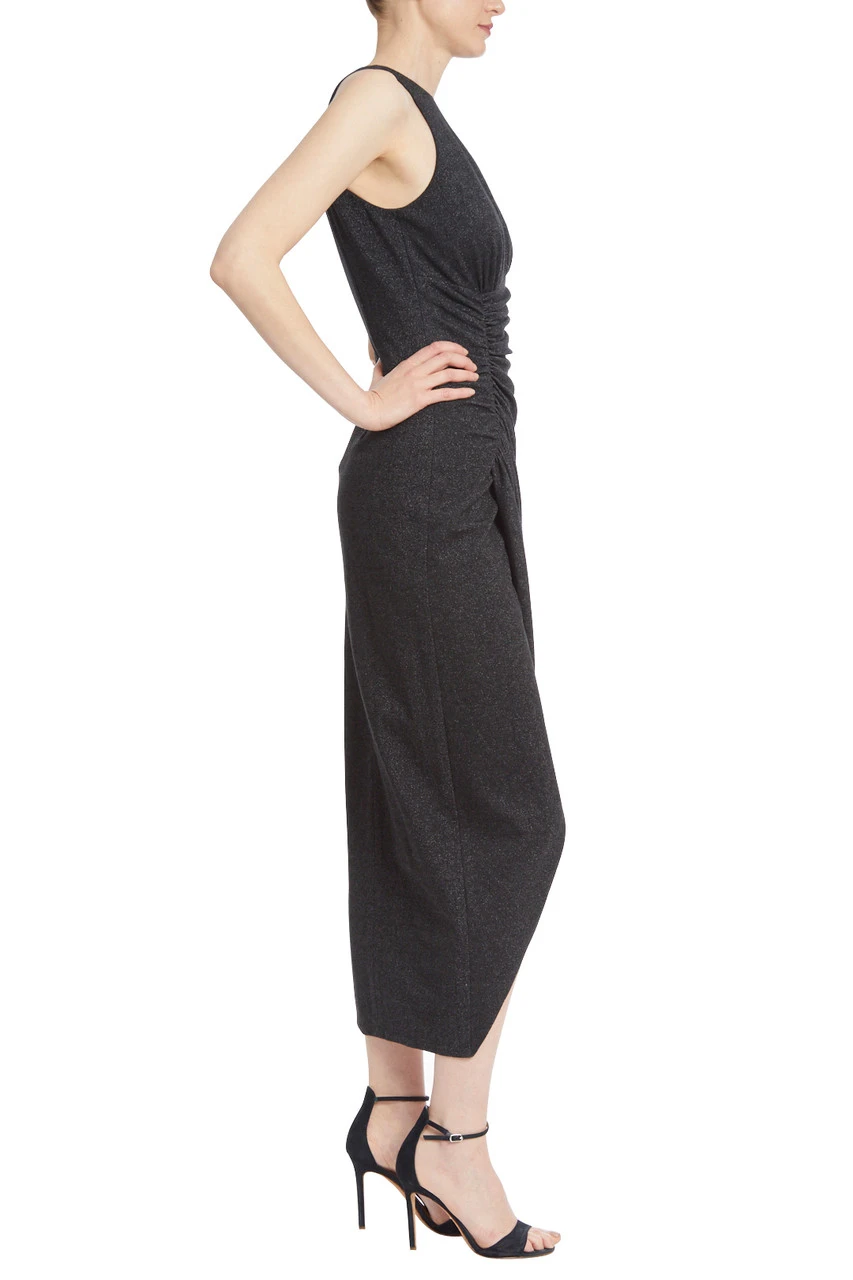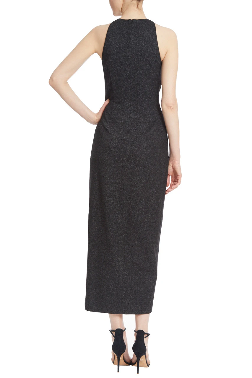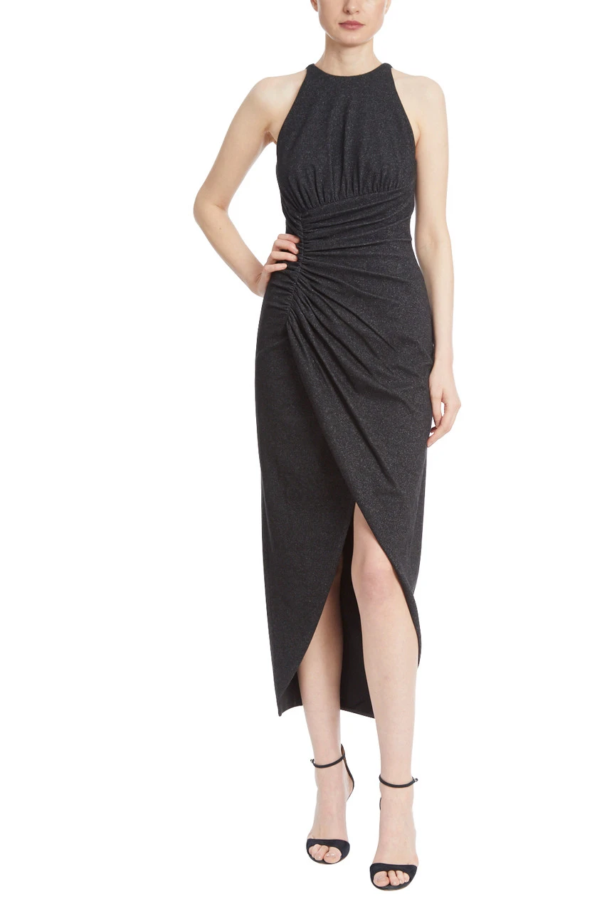 This elegant black sheath dress is a timeless style that you can wear for any occasion. The halter neckline and sleeveless styling are both classic silhouettes, but the side drape detail adds a modern flair that makes you stand out from the crowd. Made from metallic material for a slight sheen, this elegant dress will be the ideal addition to your wardrobe.