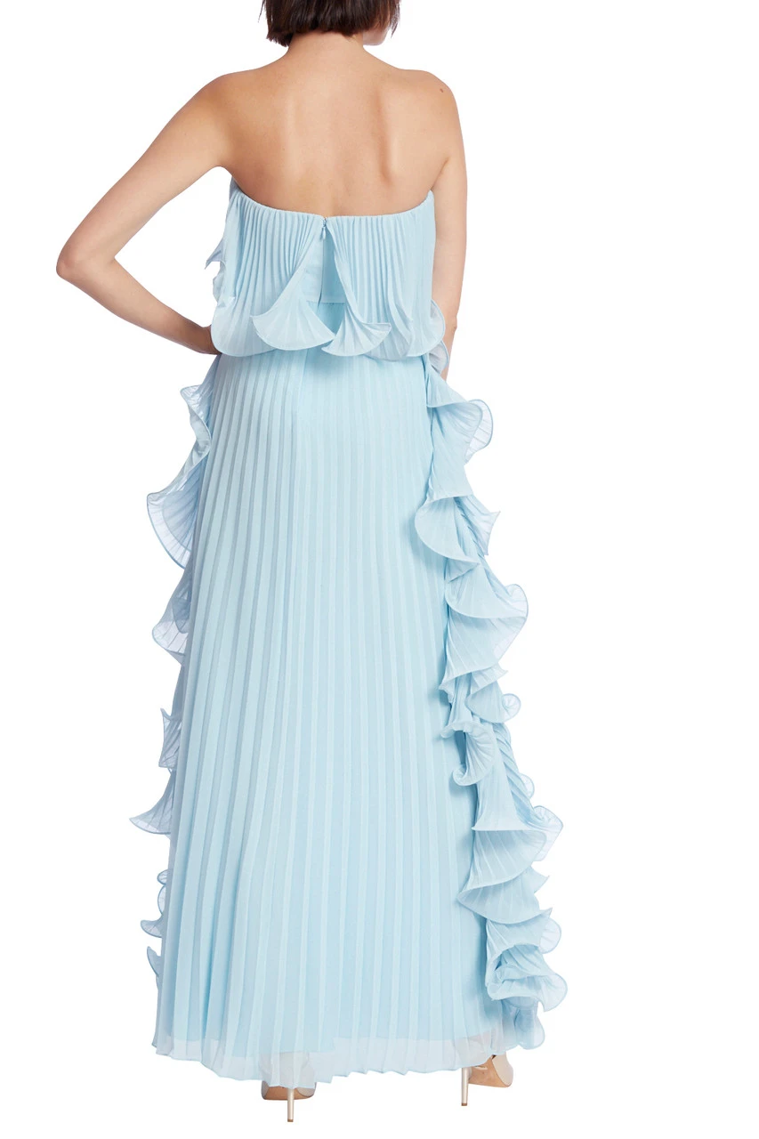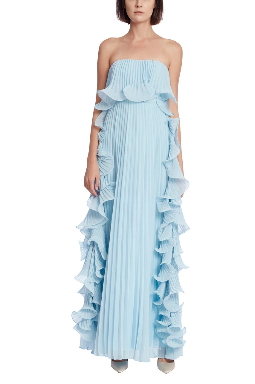 The delicate ruffles on the hem, combined with the pleated Georgette fabric throughout, gives this dress a light and airy feel in its column-shaped silhouette. The strapless bodice completes the dress, adding a touch of class to its feminine design.