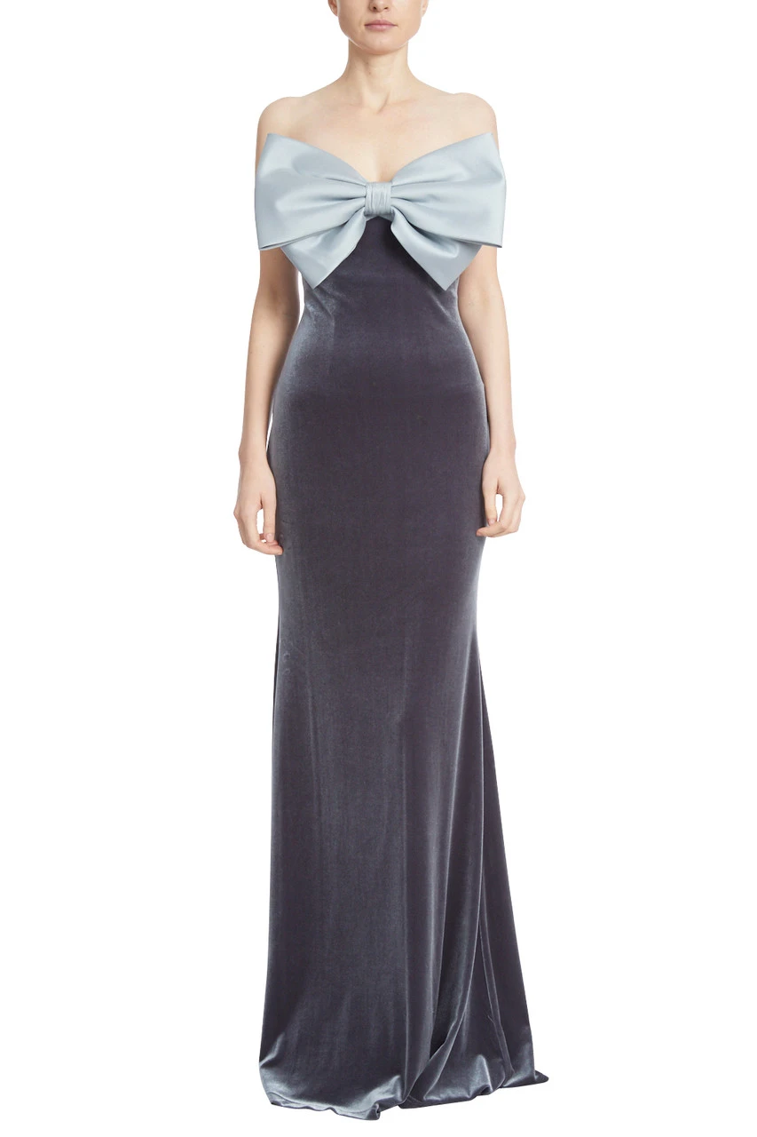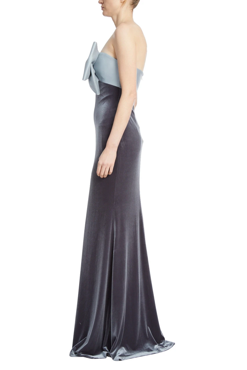 Dazzle at twilight in a tapered, floor-length gown designed to hug each curve. Effortlessly simple in its construction, this silky velvet dress mirrors the delicate moonlight of a starry night. A silver bow adds the final touch to a modern classic gown.
