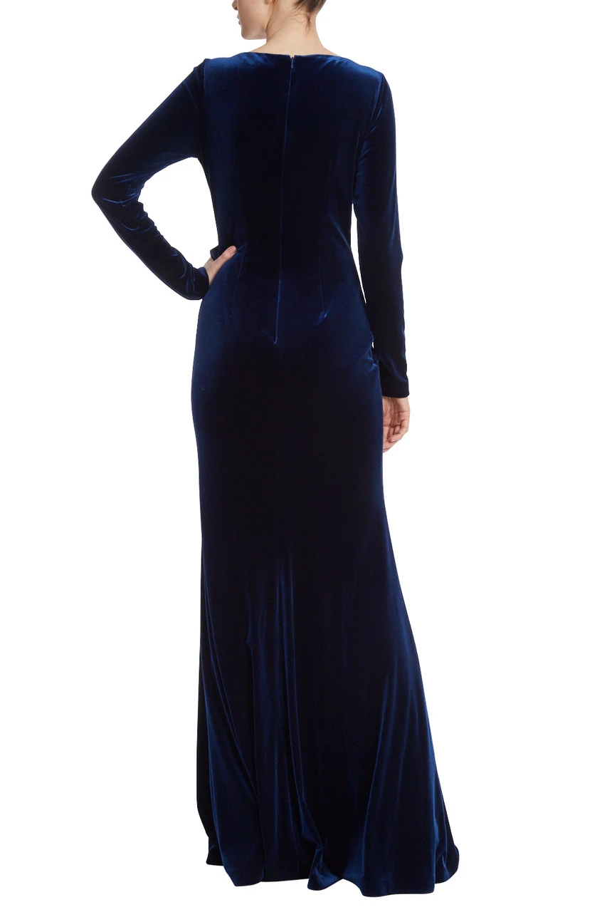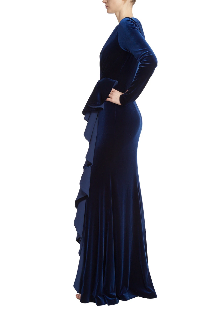 Midnight blue has never looked more magical than on you, in this perfect full-length stretch velvet gown. This majestic look flatters your figure, gathering around your waist and cascading to the floor in decadent ruffles. Add Badgley Mischka statement earring to finish the look.