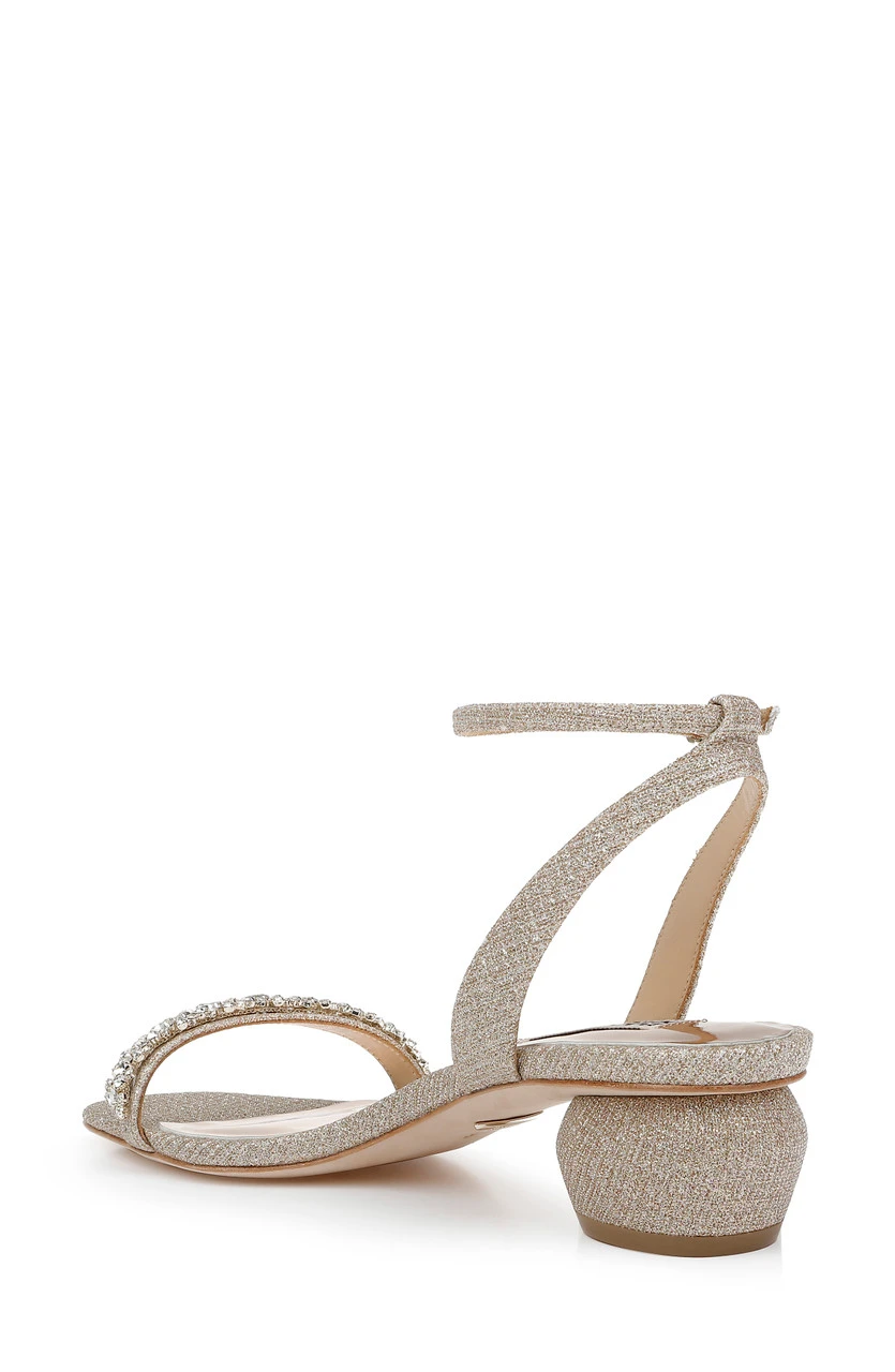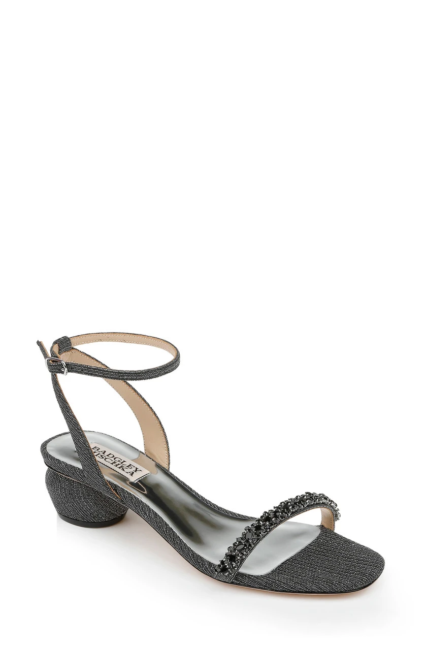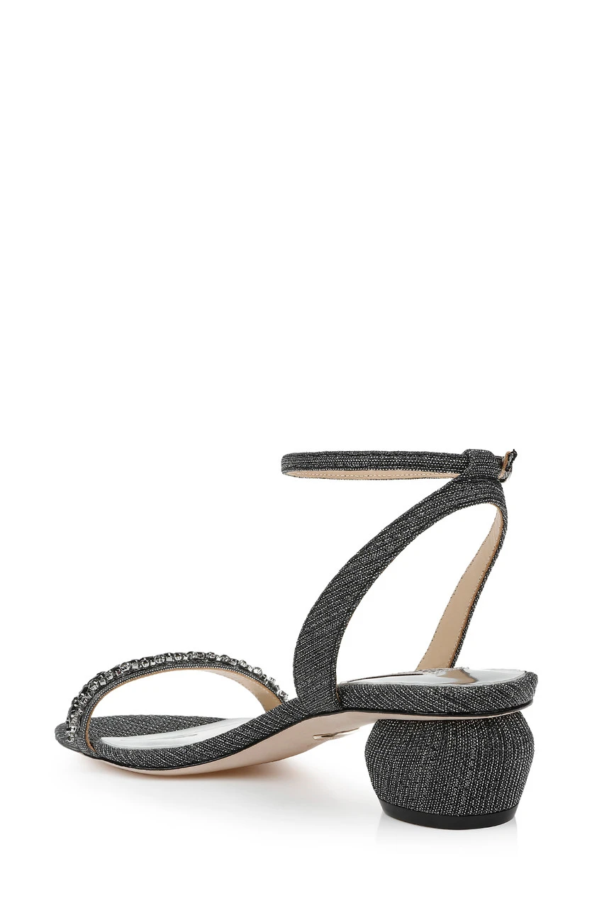 A chunky low heel gives you just enough of a lift to aid your posture and give you a sense of poise. A sling back, delicate buckled ankle strap, and crystal-adorned vamp complete this look.