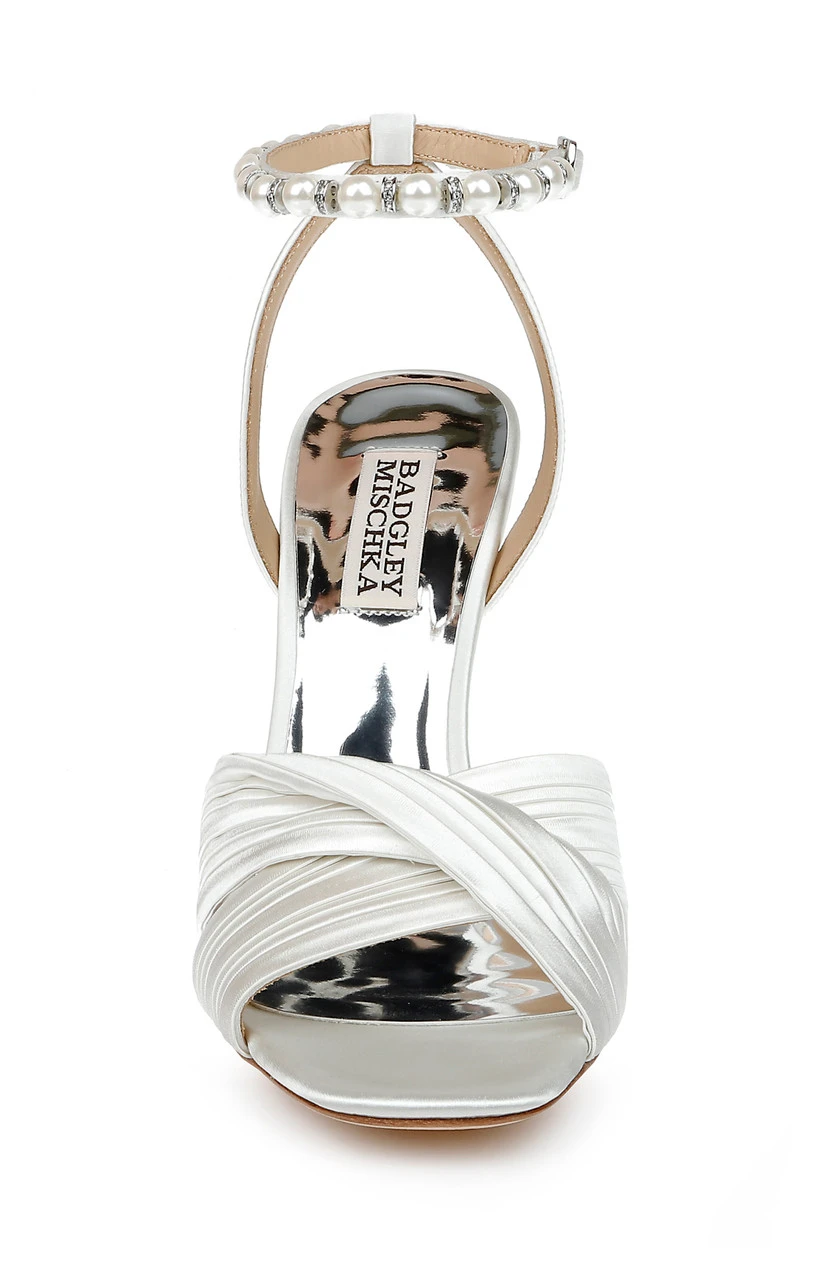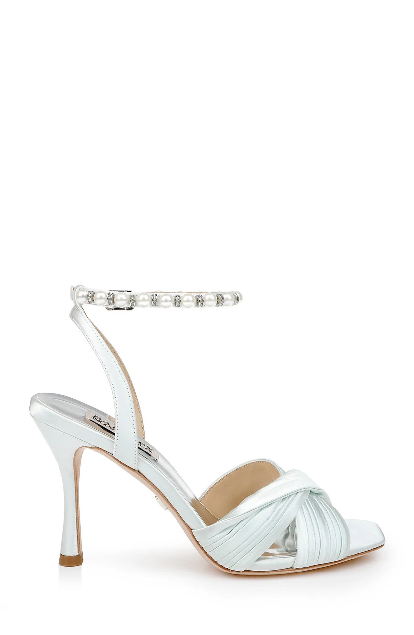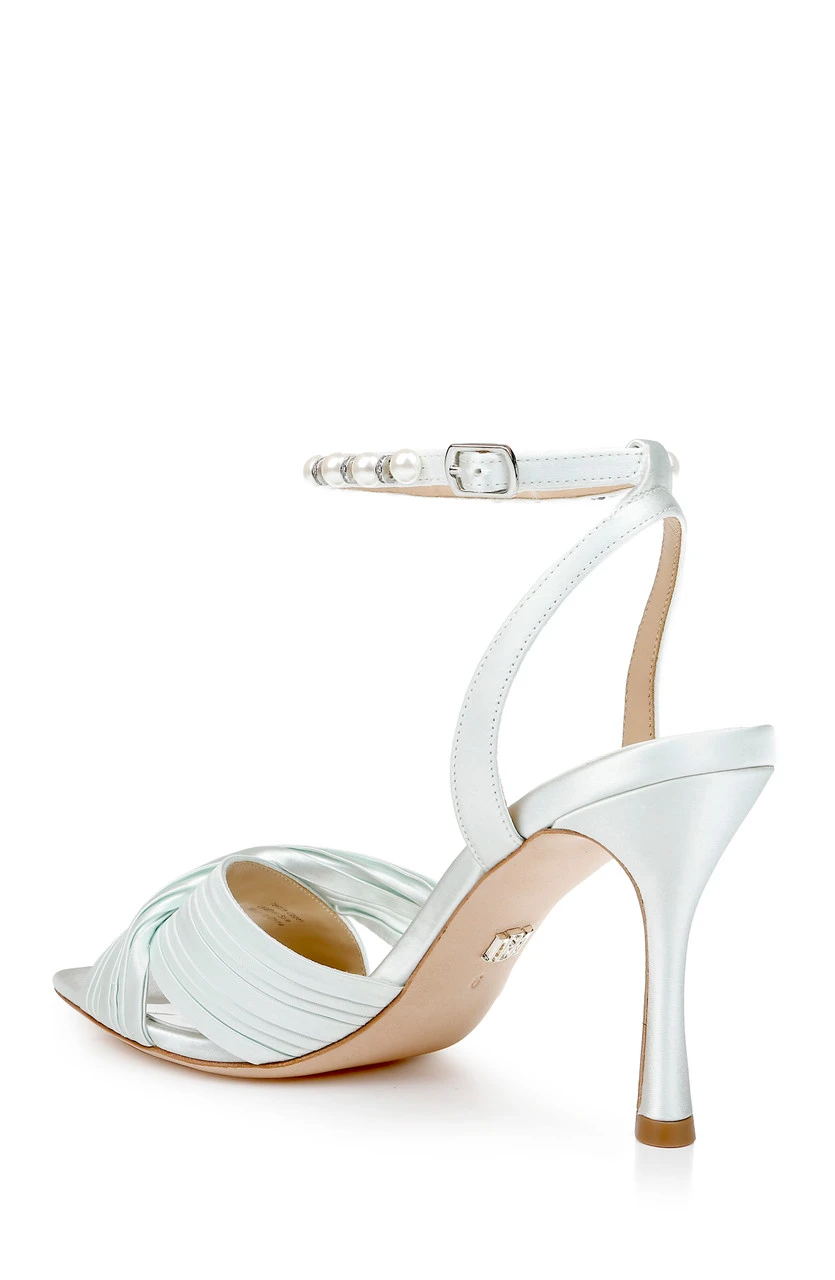 The pleated satin crossover vamp is the highlight of this piece. Pearls detail the ankle strap creating an air of serenity and luxury.