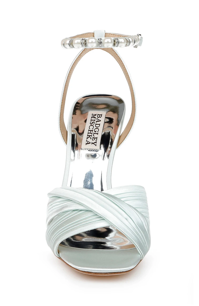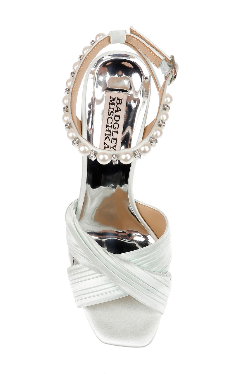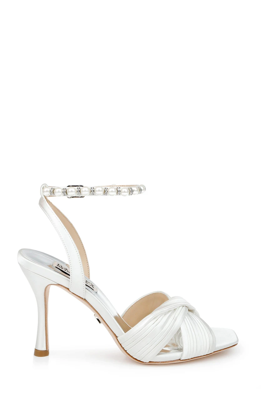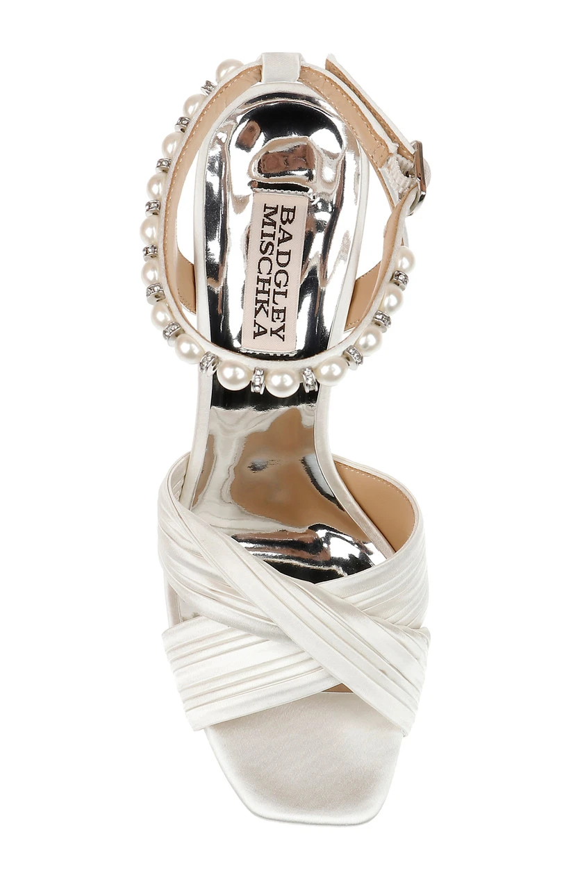 The pleated satin crossover vamp is the highlight of this piece. Pearls detail the ankle strap creating an air of serenity and luxury.