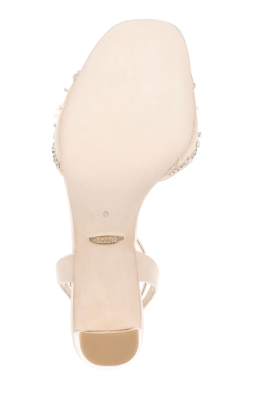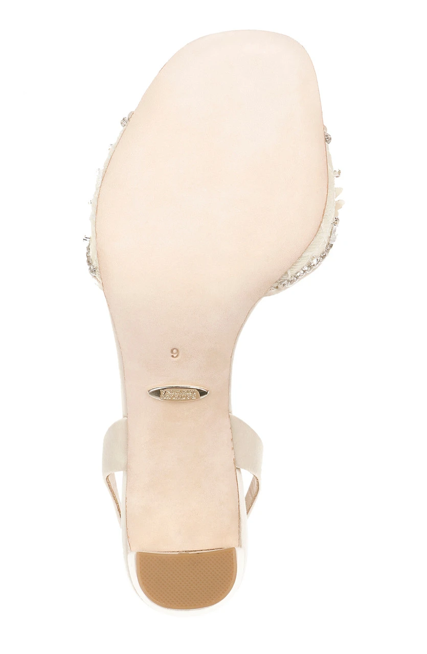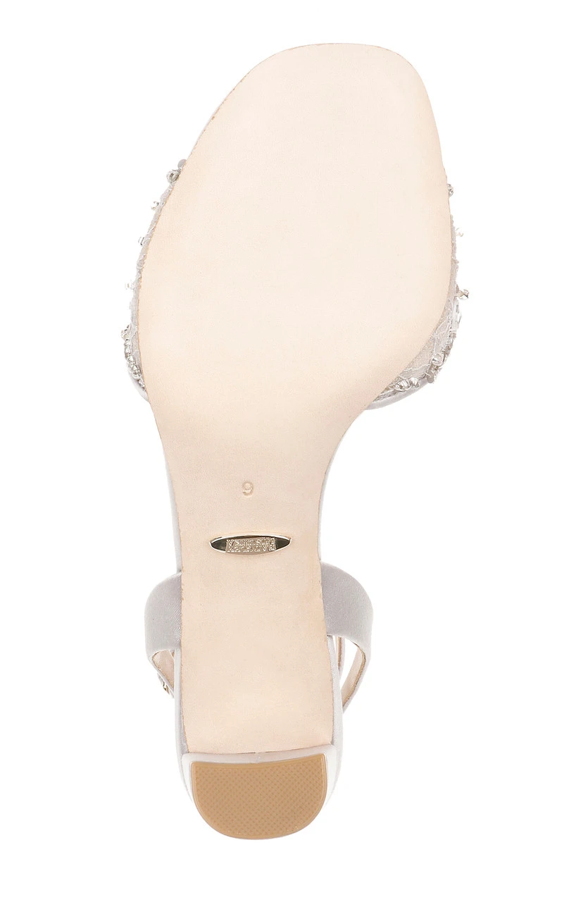 This look celebrates contrast in design, with delicate feminine detail perfectly complementing an assertive block heel. Perfect for a modern bride with more to her personality.