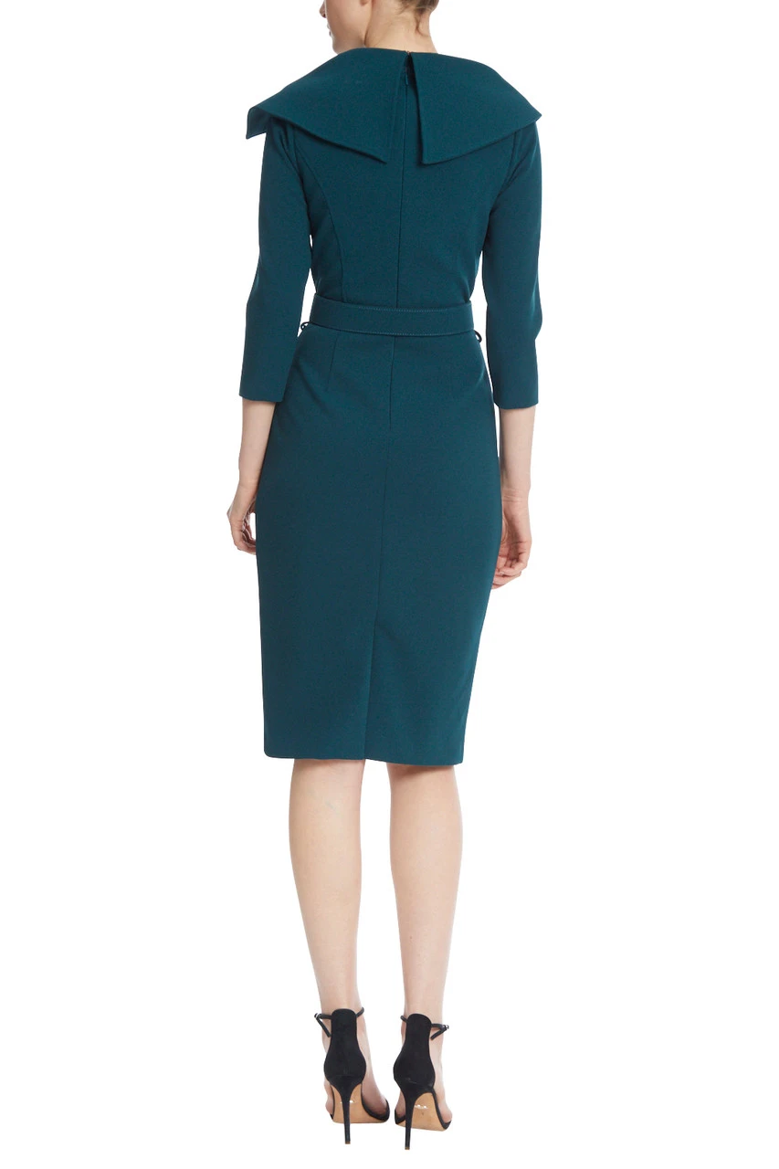 This elegant teal dress is the perfect blend of classy and casual. The high, folded collar and 3/4 sleeves are both classic and feminine, while the fitted sheath silhouette flatters every figure type. The belt accentuating your waistline enhances the flattering effect of this dress even further.