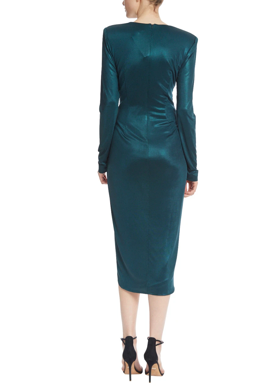 This dress features a deep V-neck and an elegant slit in the front that drapes to the sides for a look that is both classic and modern at once. The shoulder pads and long sleeves adds sophistication to this form-fitting dress, which hugs your curves in all the right places.