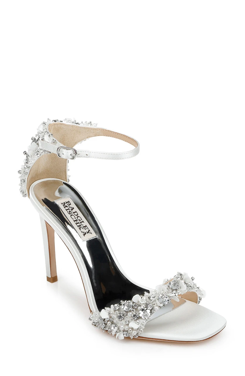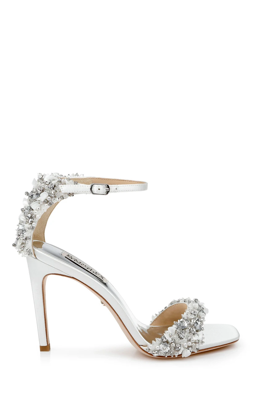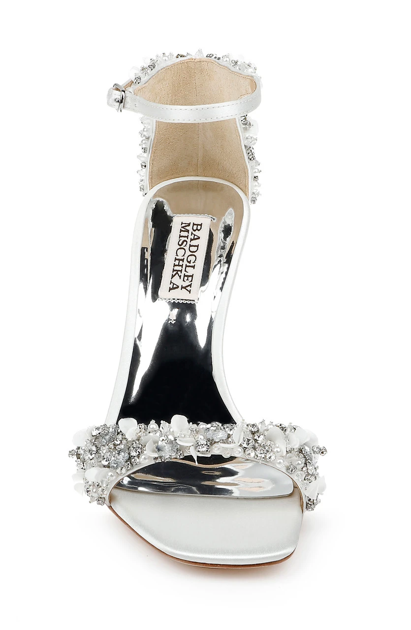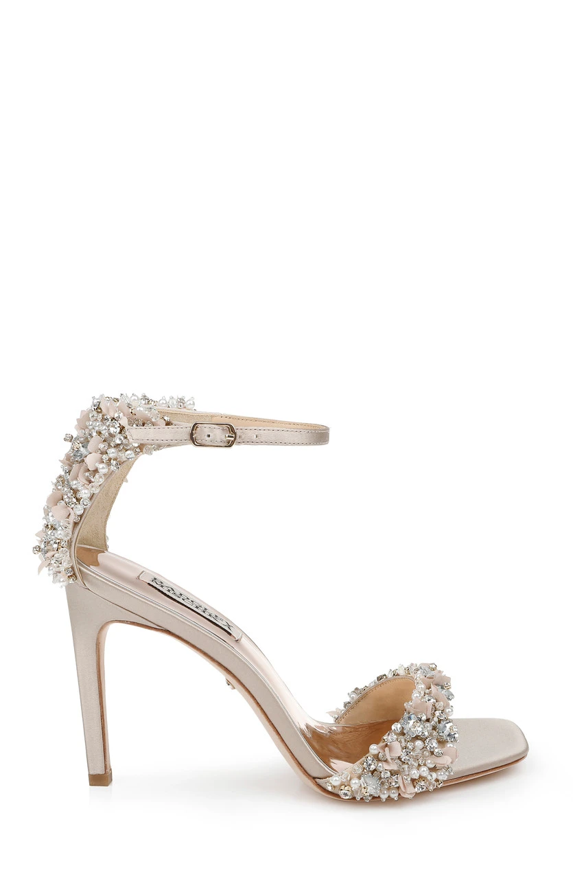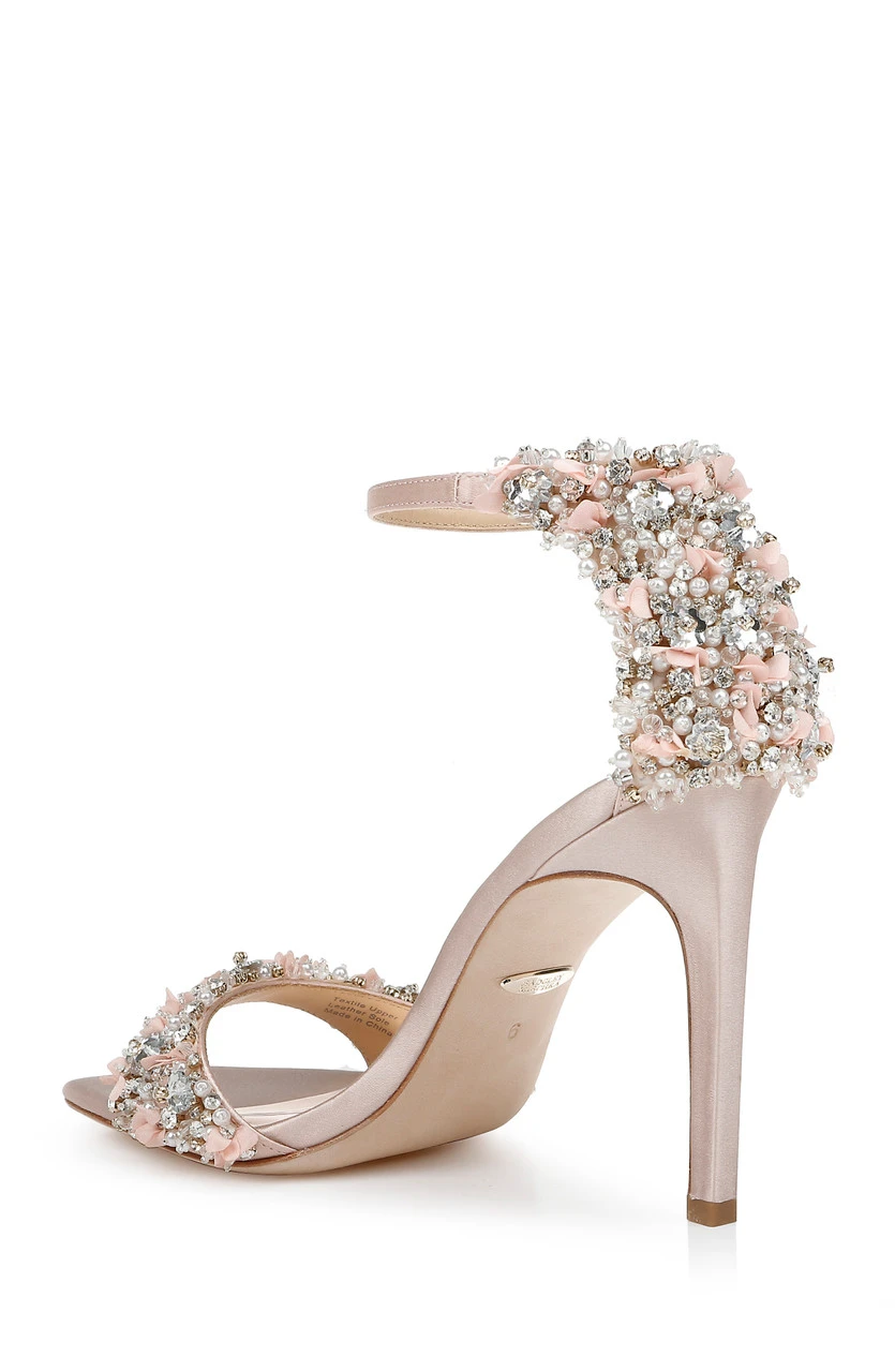 Glittering gemstones at the vamp and heel ensure all eyes are on you, from every direction. Silk satin and crystals add multi-textured appeal to this chic party-girl look. For a similar style with a kitten heel, see Telissa.