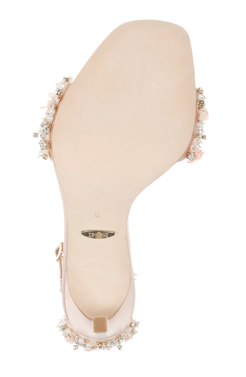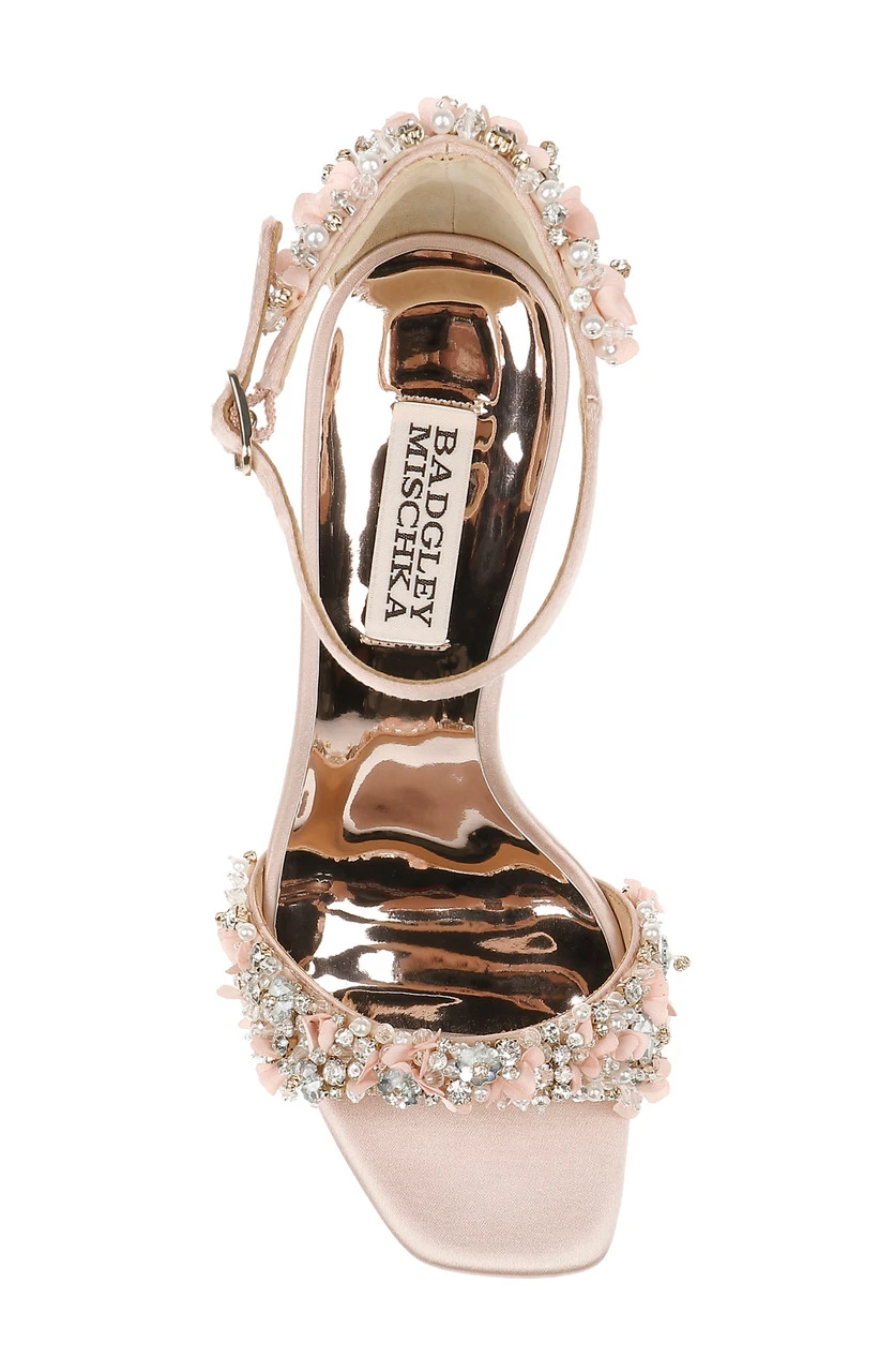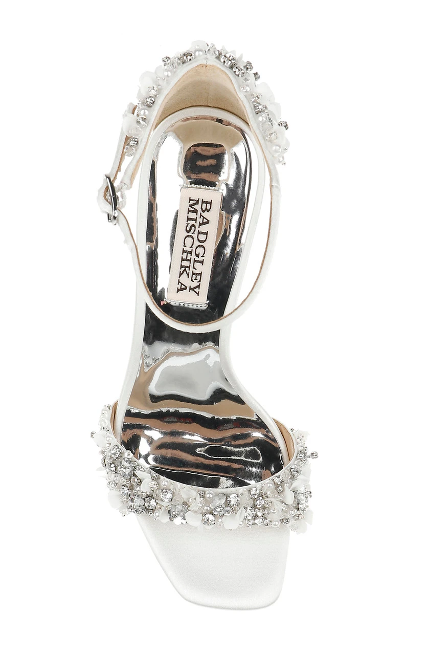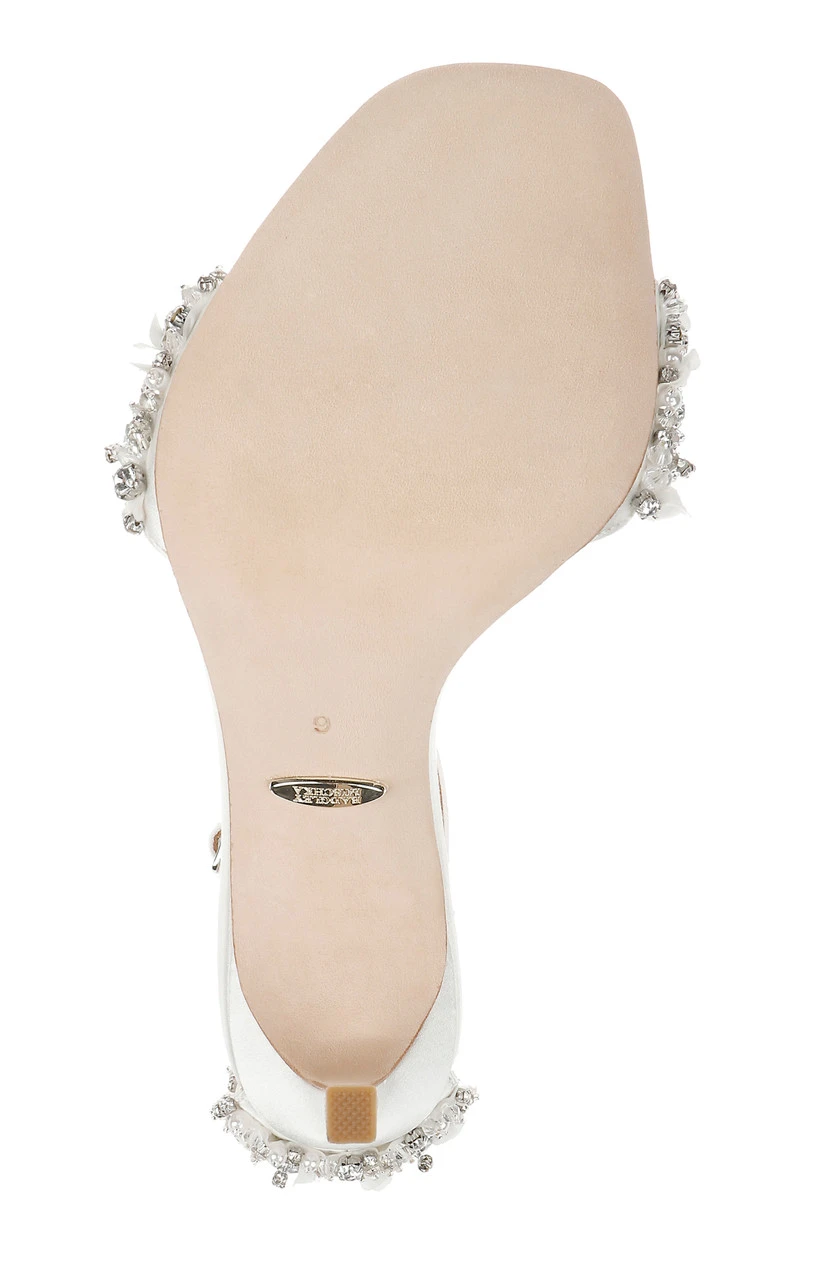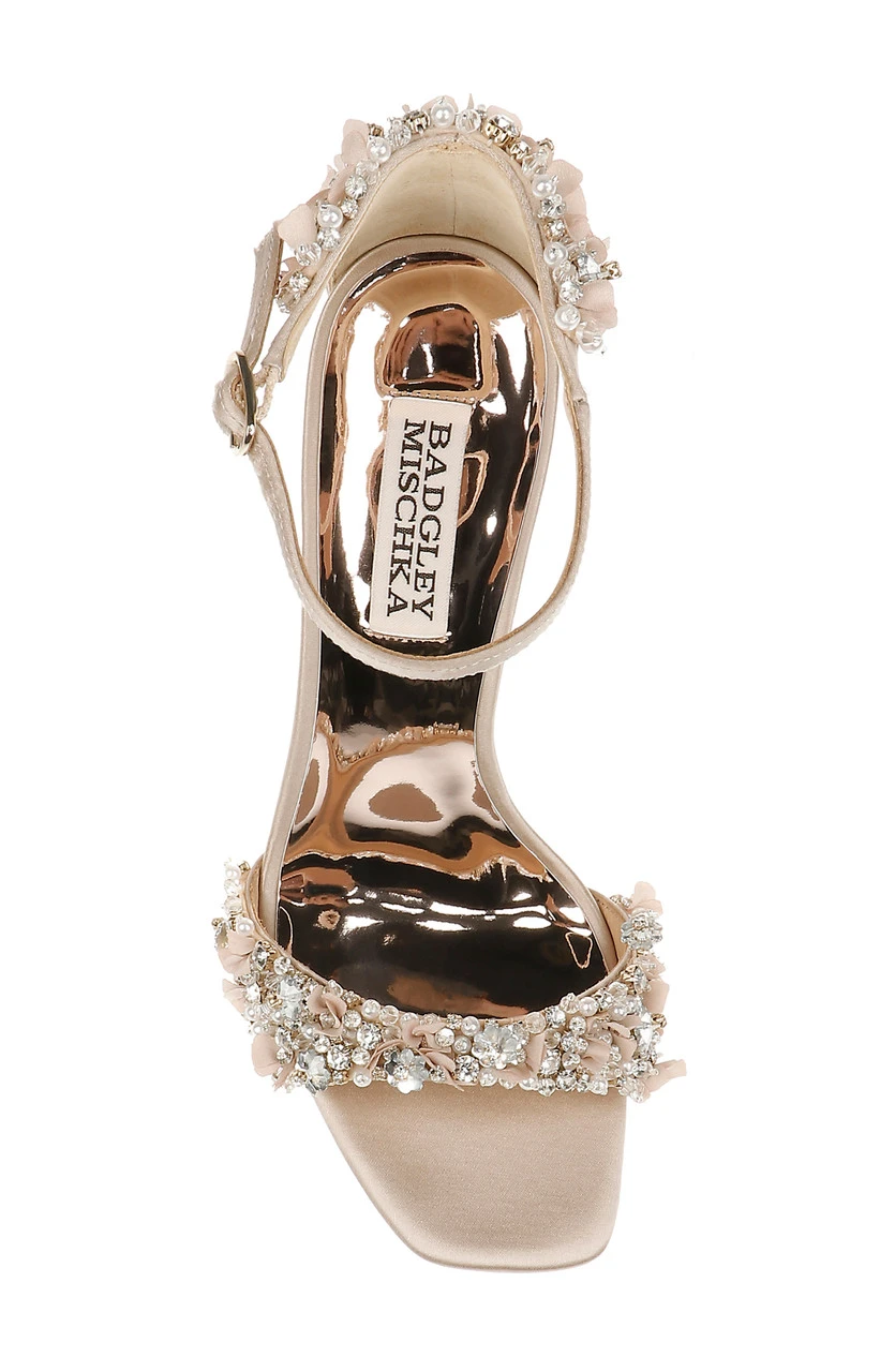Glittering gemstones at the vamp and heel ensure all eyes are on you, from every direction. Silk satin and crystals add multi-textured appeal to this chic party-girl look. For a similar style with a kitten heel, see Telissa.