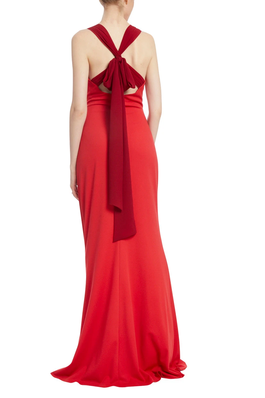 In red and burgundy, this two-toned beauty will forever be in vogue. This gorgeous gown offers elegance and simplicity at first glance – with an unexpected graceful twist at the back. Timeless bridesmaids and black-tie guests will favor this look for years to come.