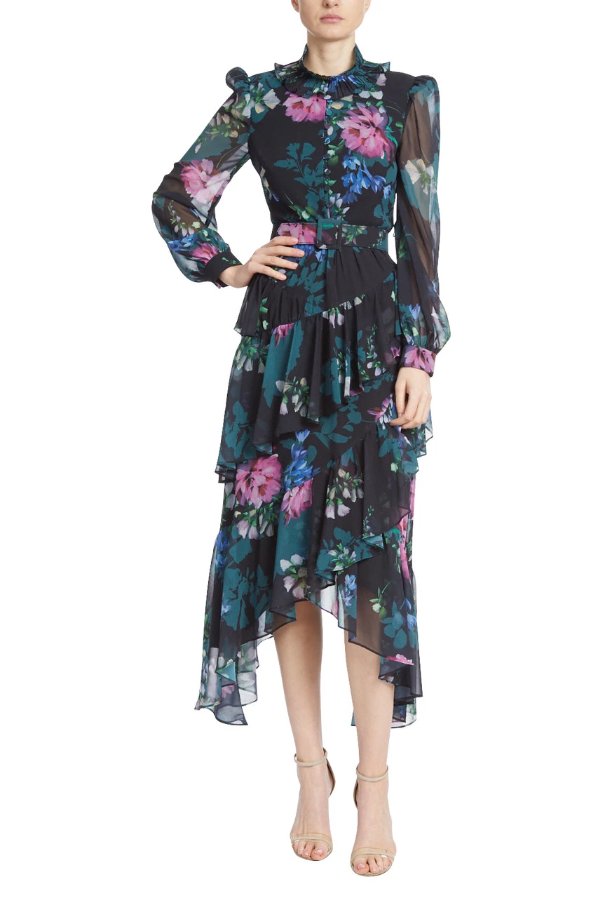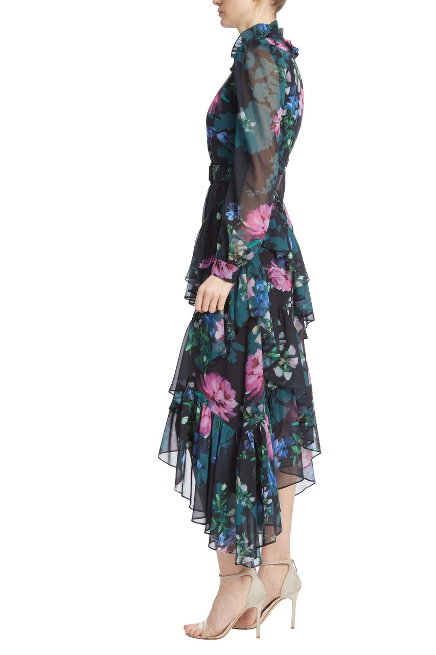 The romantic print, tiered asymmetrical skirt, ruffled neck, and sheer sleeves perfectly complement each other, creating this stunning look. Wear this outfit with your favorite pair of Badgley Mischka heels or dress it down with a leather moto jacket and boots.