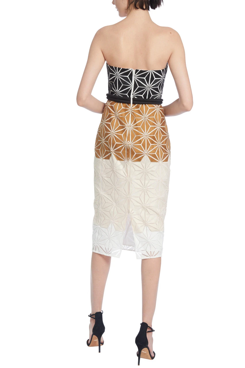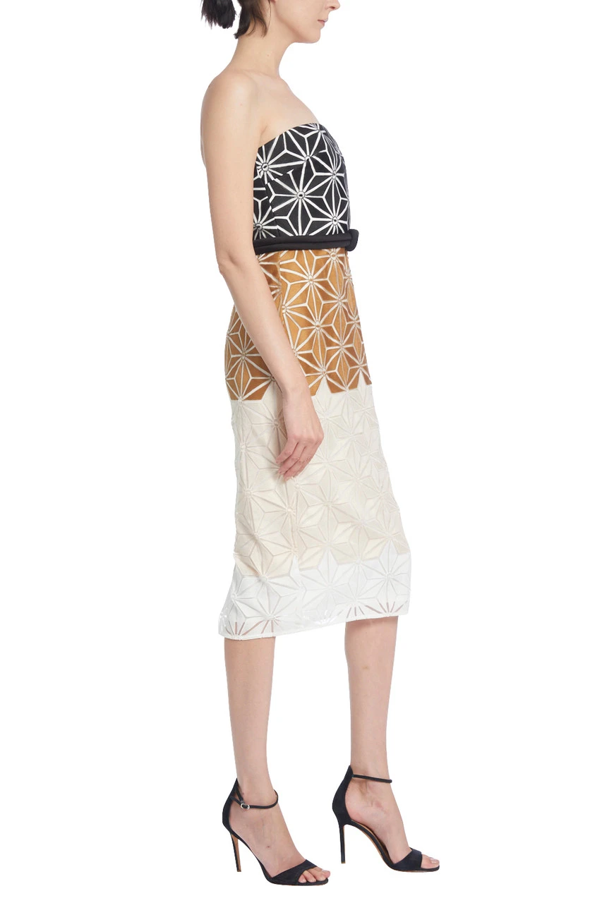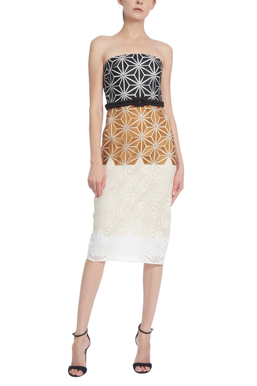 SC3826 | Tri-Colored Strapless Dress with Geometric Embroidered Print