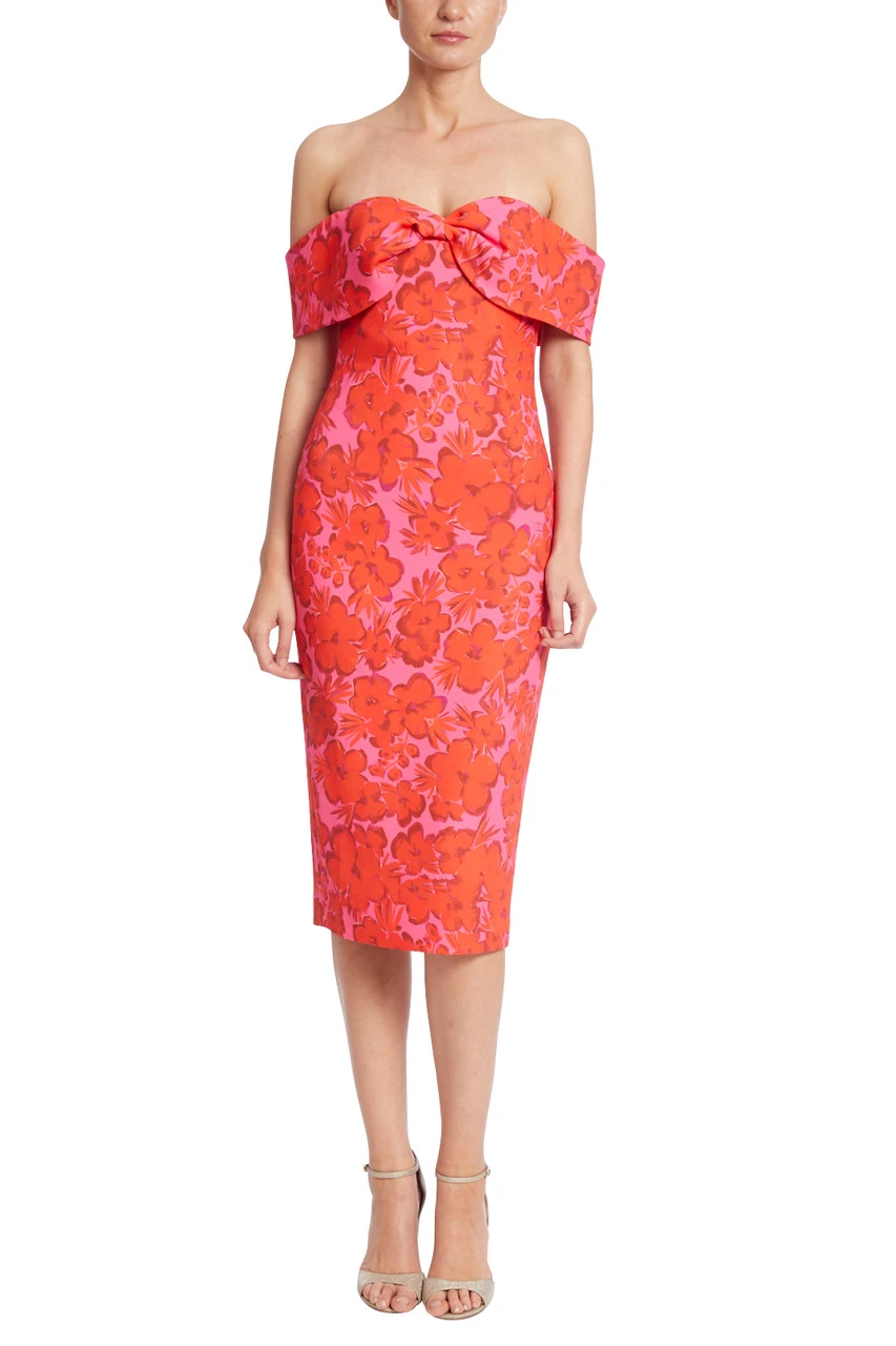 The Twisted Off-Shoulder Sheath Dress is a romantic ‘twist’ on the classic cocktail style. The twisted “bow”neckline and off-the-shoulder detail make this dress a stunning choice for an elegant evening affair. The bold floral print is the perfect complement to its feminine silhouette—making it eye-catching without being overwhelming. Pair it with delicate BM jewelry and heels for an ensemble that is sure to turn heads.