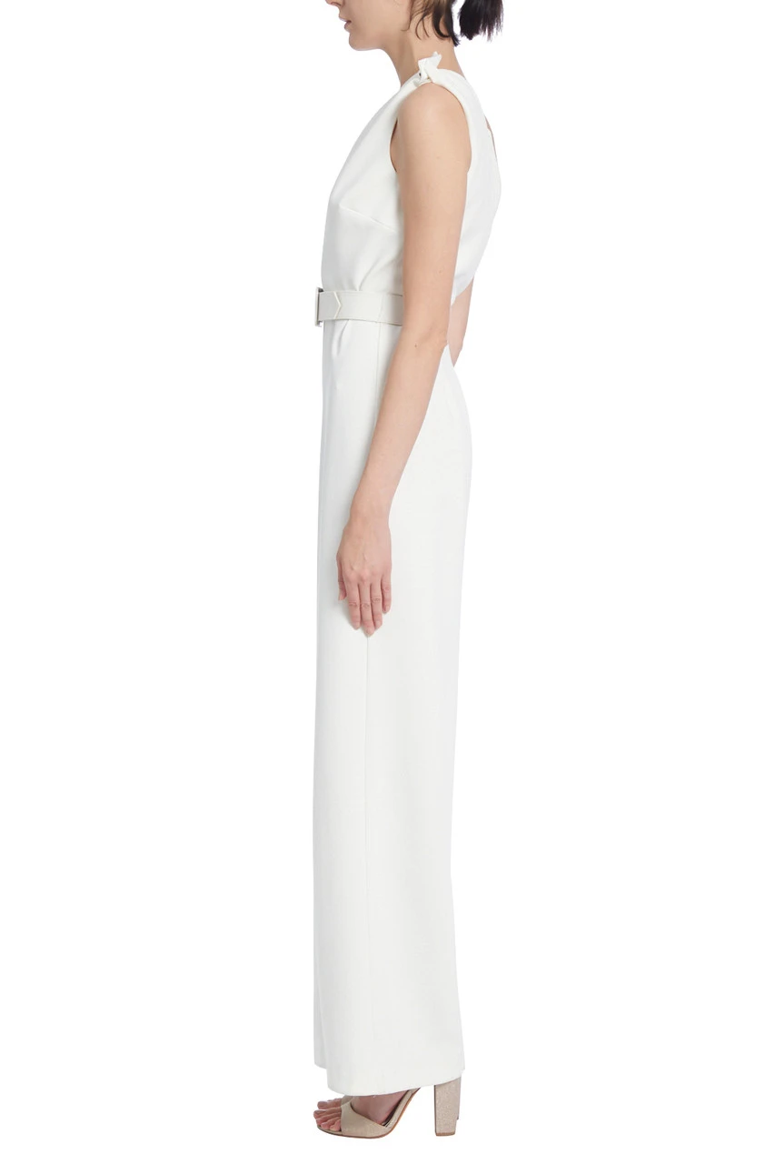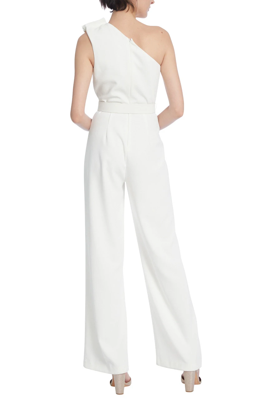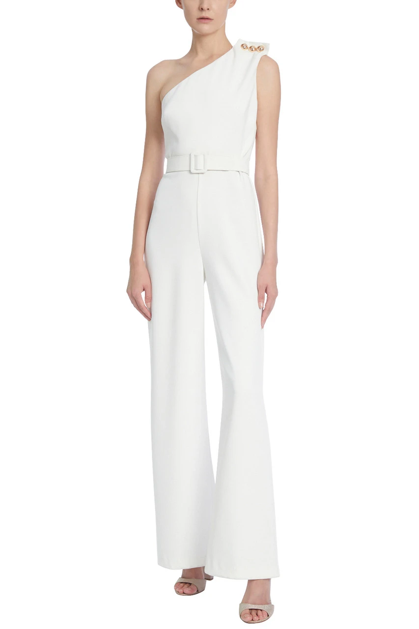 Made from soft and flowing white fabric, this jumpsuit boasts a one-shoulder design accented with three large decorative metal buttons. The jumpsuit is belted around your waist for a flattering silhouette, and its wide legs make it easy to move in.