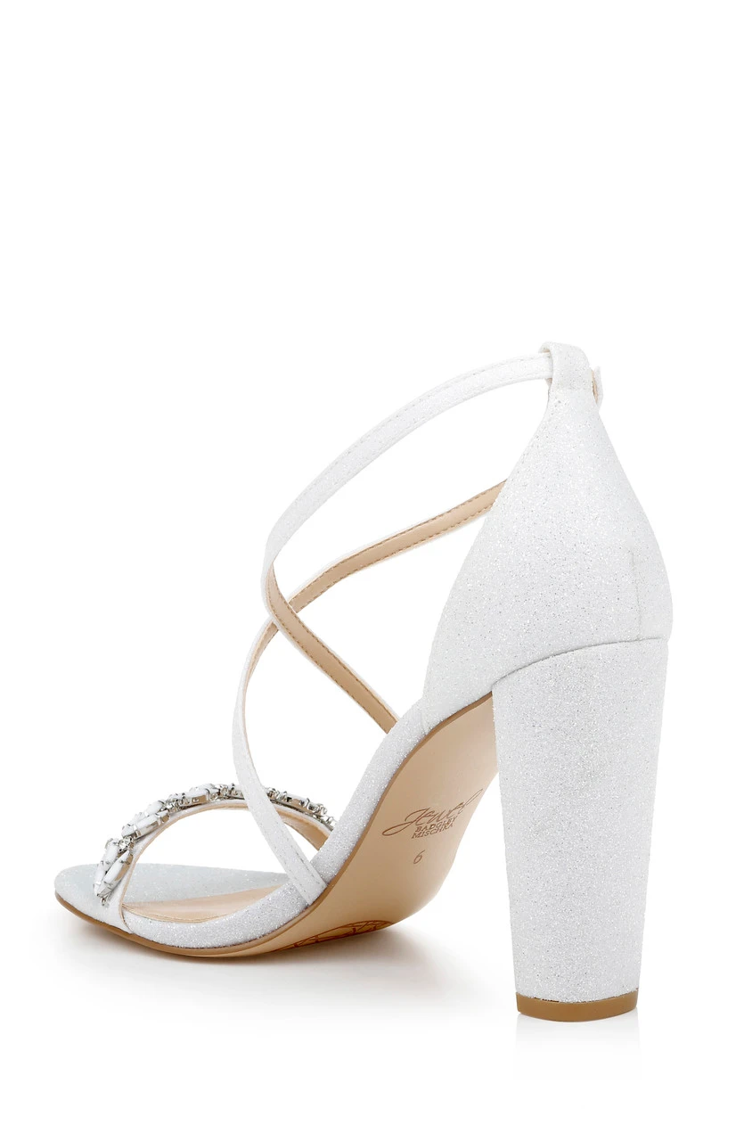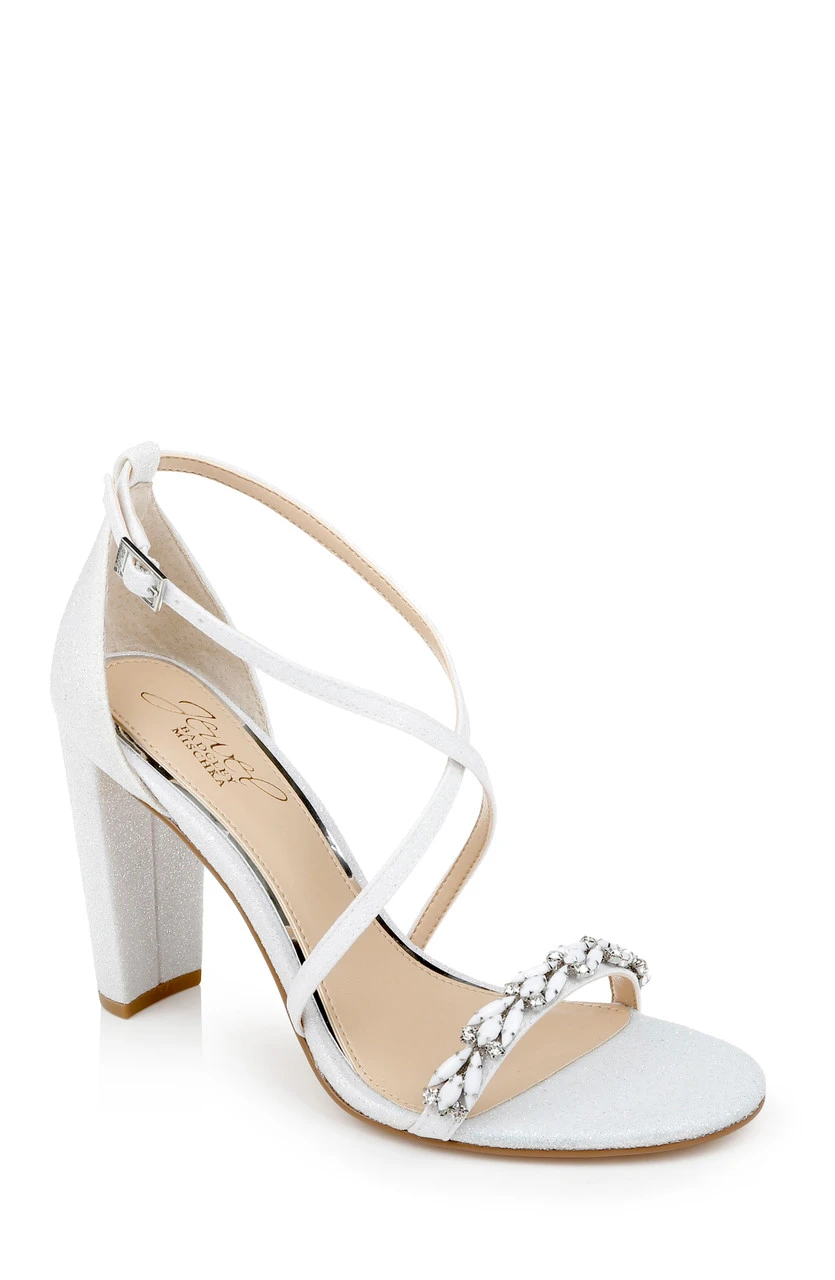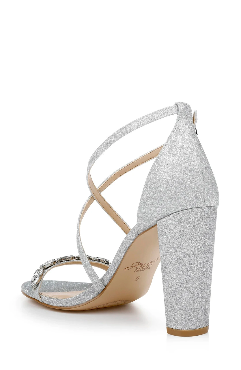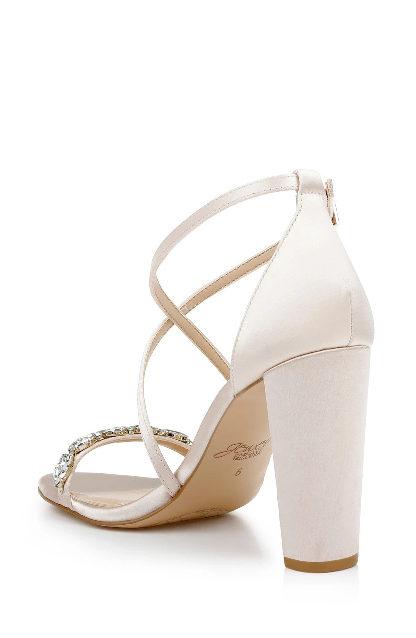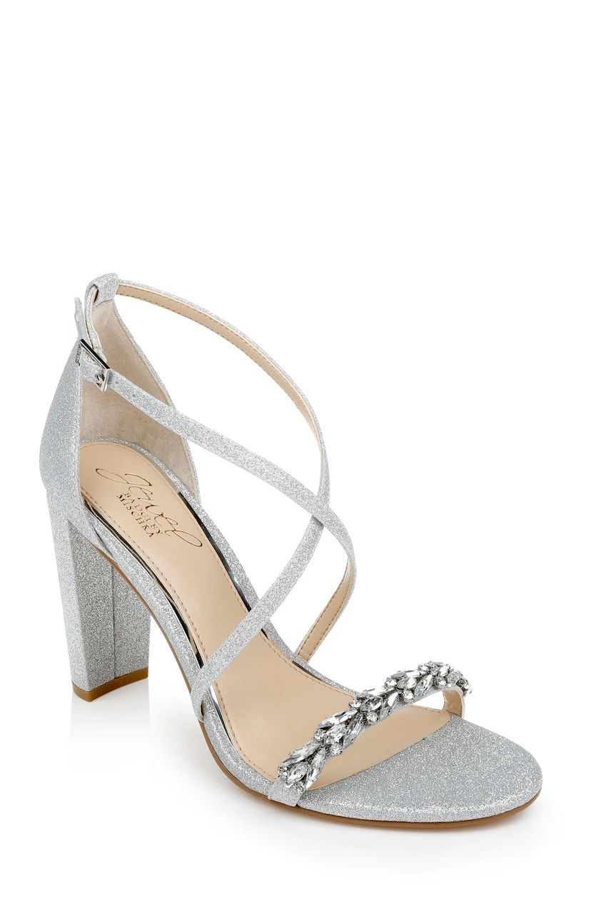 Sky-high block heels with delicate crisscross straps add strength and poise to your look. Choose this style in satin or glitter, for your best-dressed moment yet.