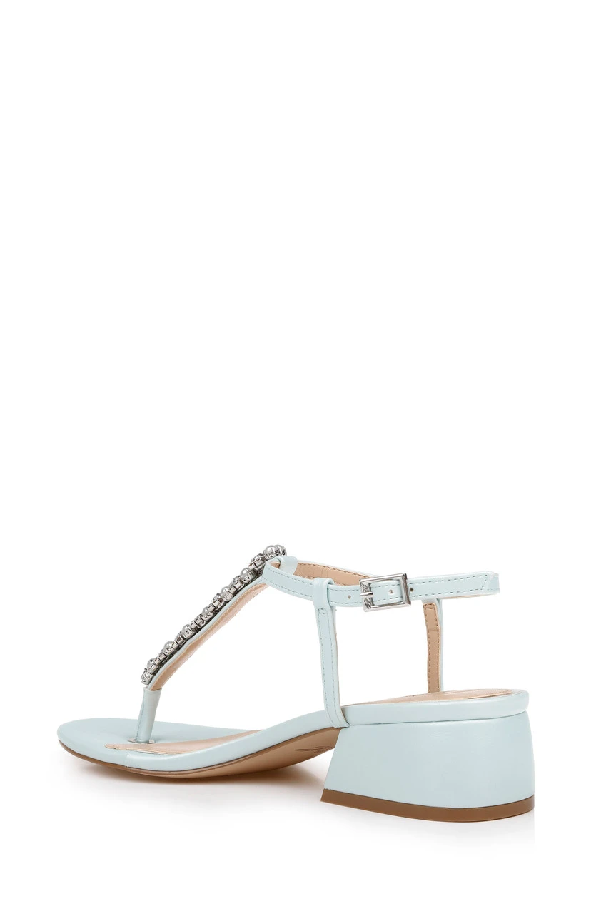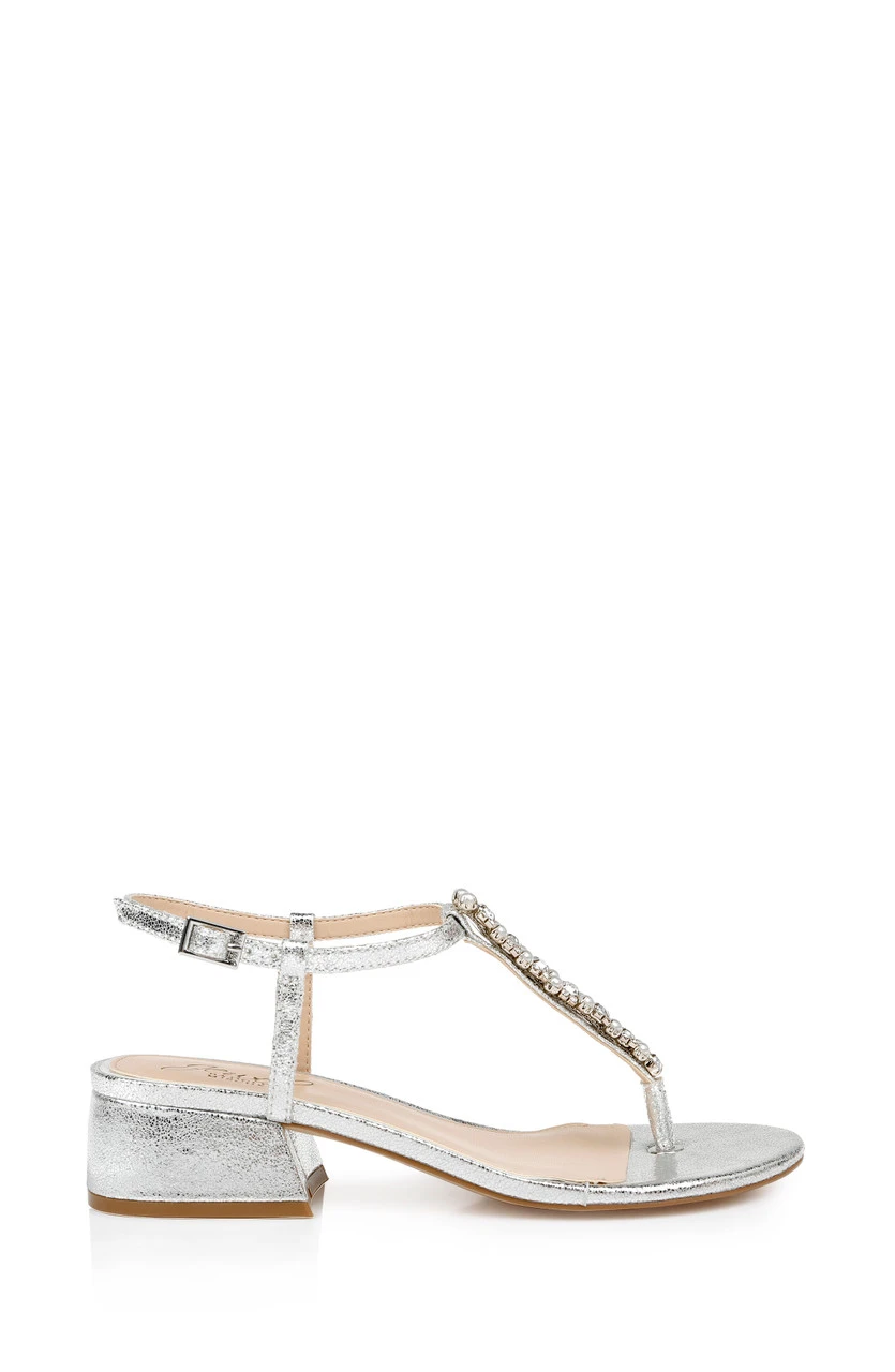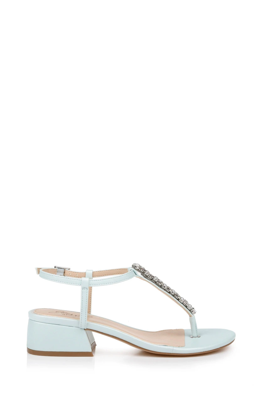 These stunning sandals come in metallic rose gold, silver, and pale blue. The beautiful thong strap is adorned with crystals.
