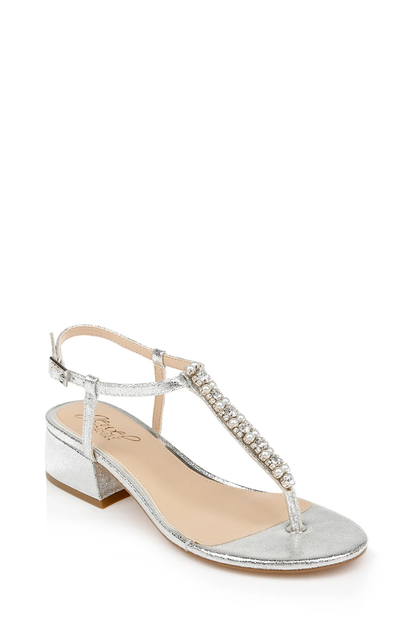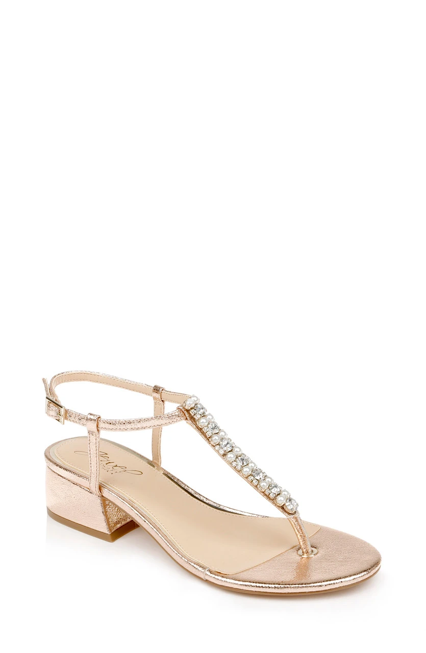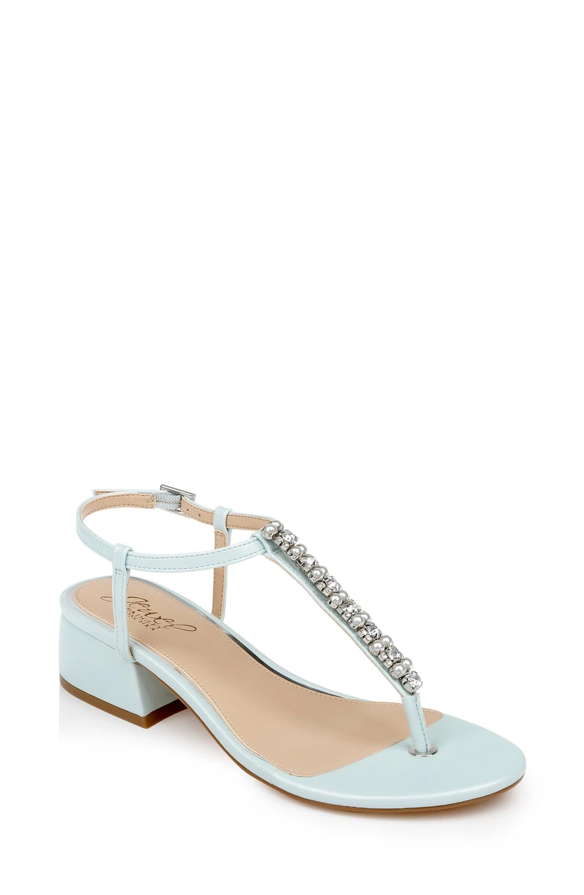 These stunning sandals come in metallic rose gold, silver, and pale blue. The beautiful thong strap is adorned with crystals.