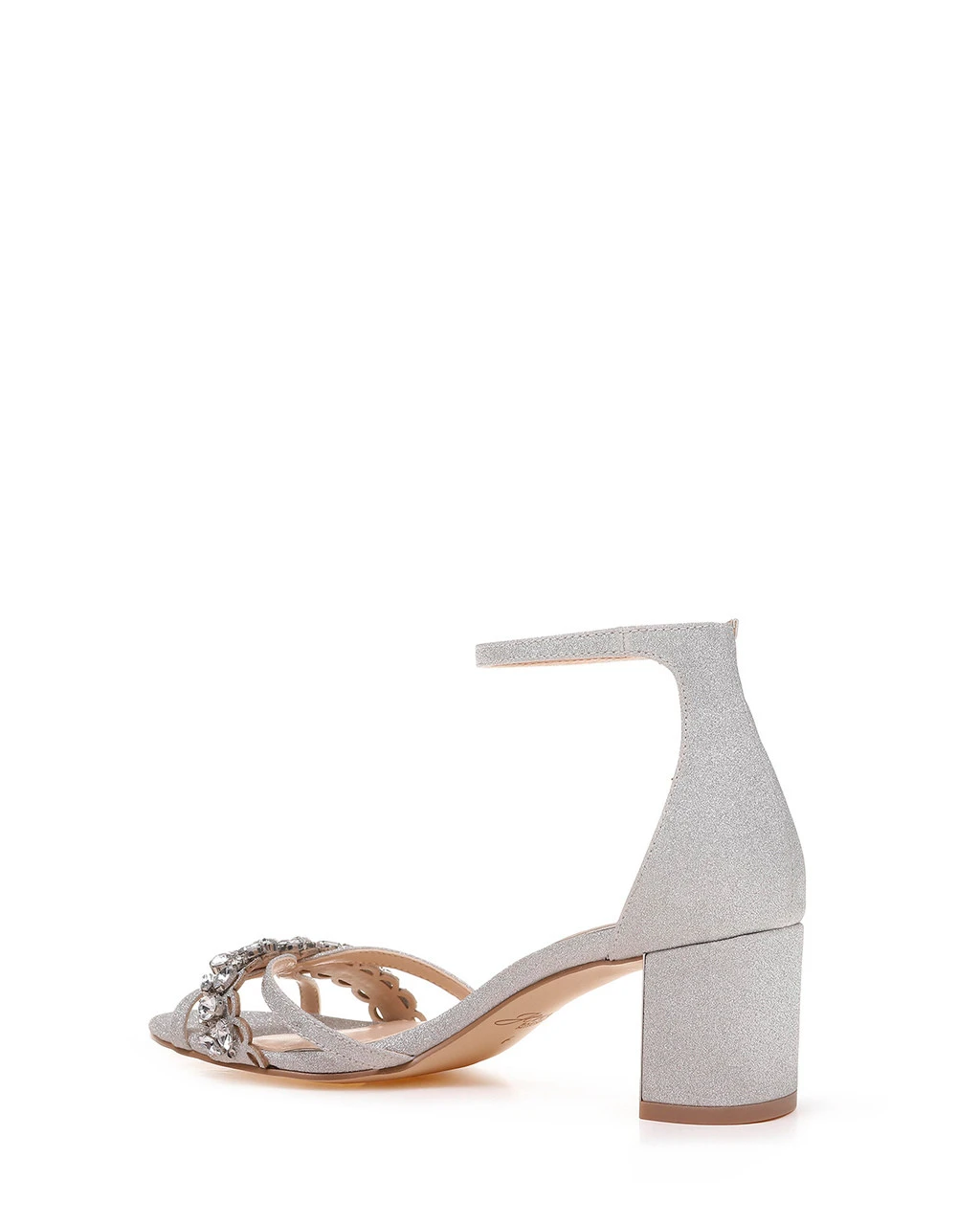Giona II by Jewel by Badgley Mischka. An open toe d’Orsay sandal featuring laser cut detail and adorned with crystal stones over crisscross straps. Ankle strap with buckle closure.