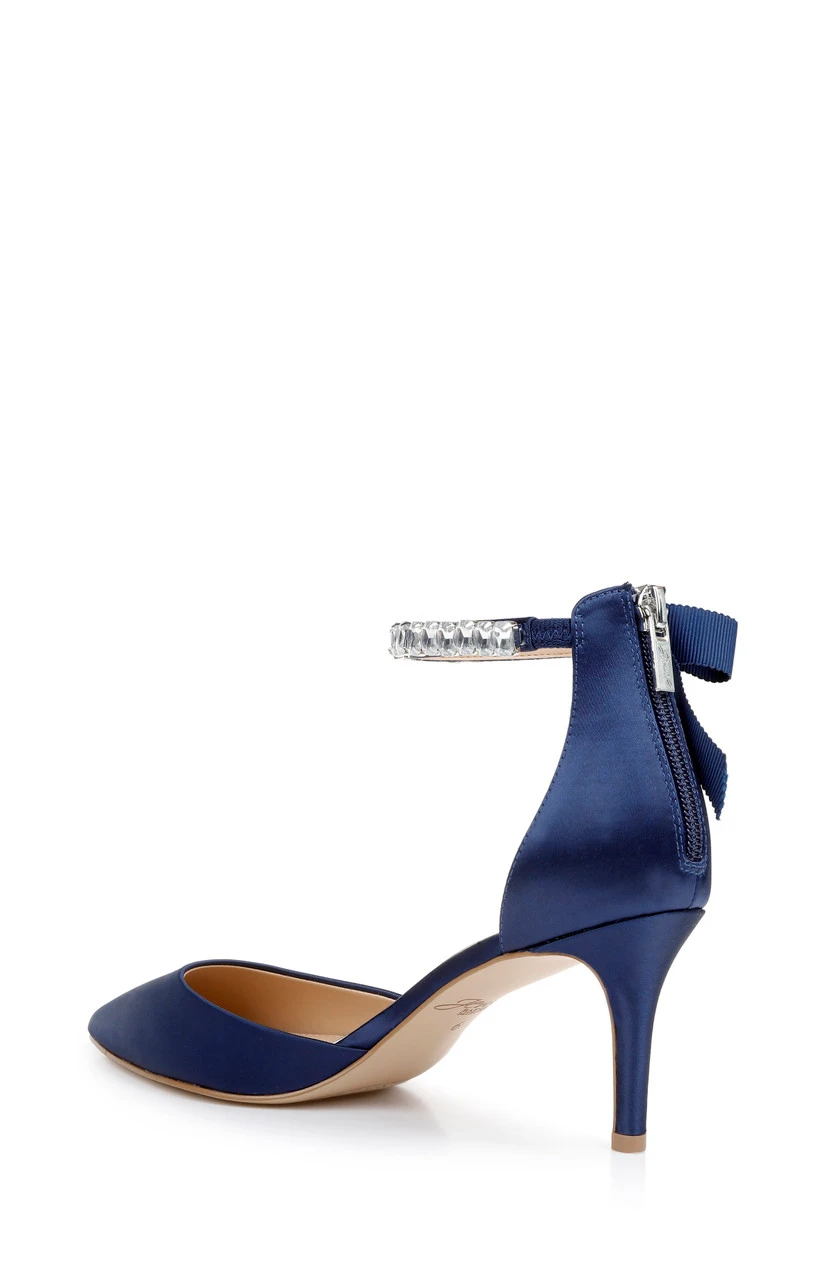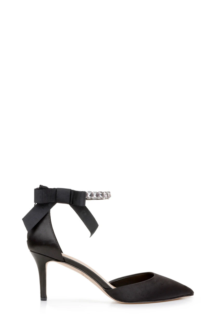 Make heads turn as you step forward in style in this pointed-toe mid heel stiletto. Stunning and chic, this style features a beautiful rhinestone ankle strap that is perfectly complemented by an elegant bow. For a similar open toe style, see Jayne.