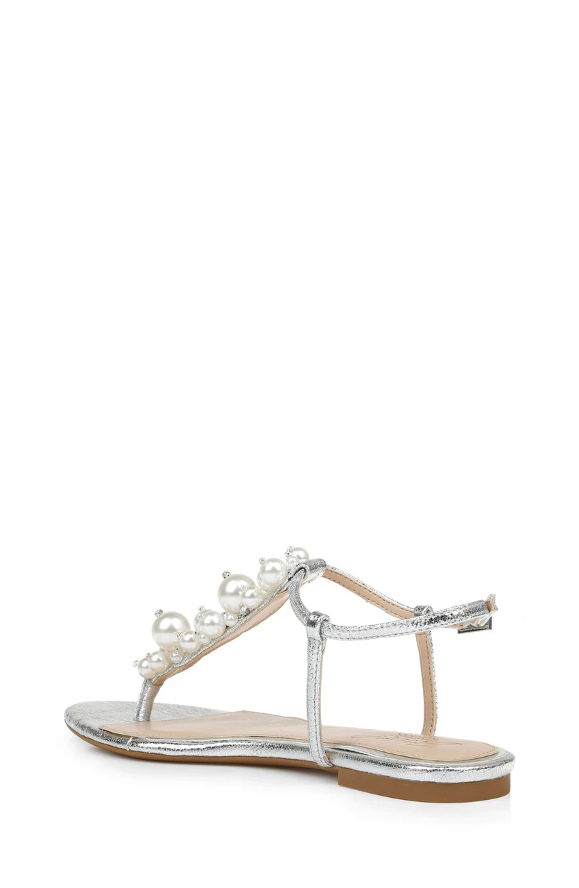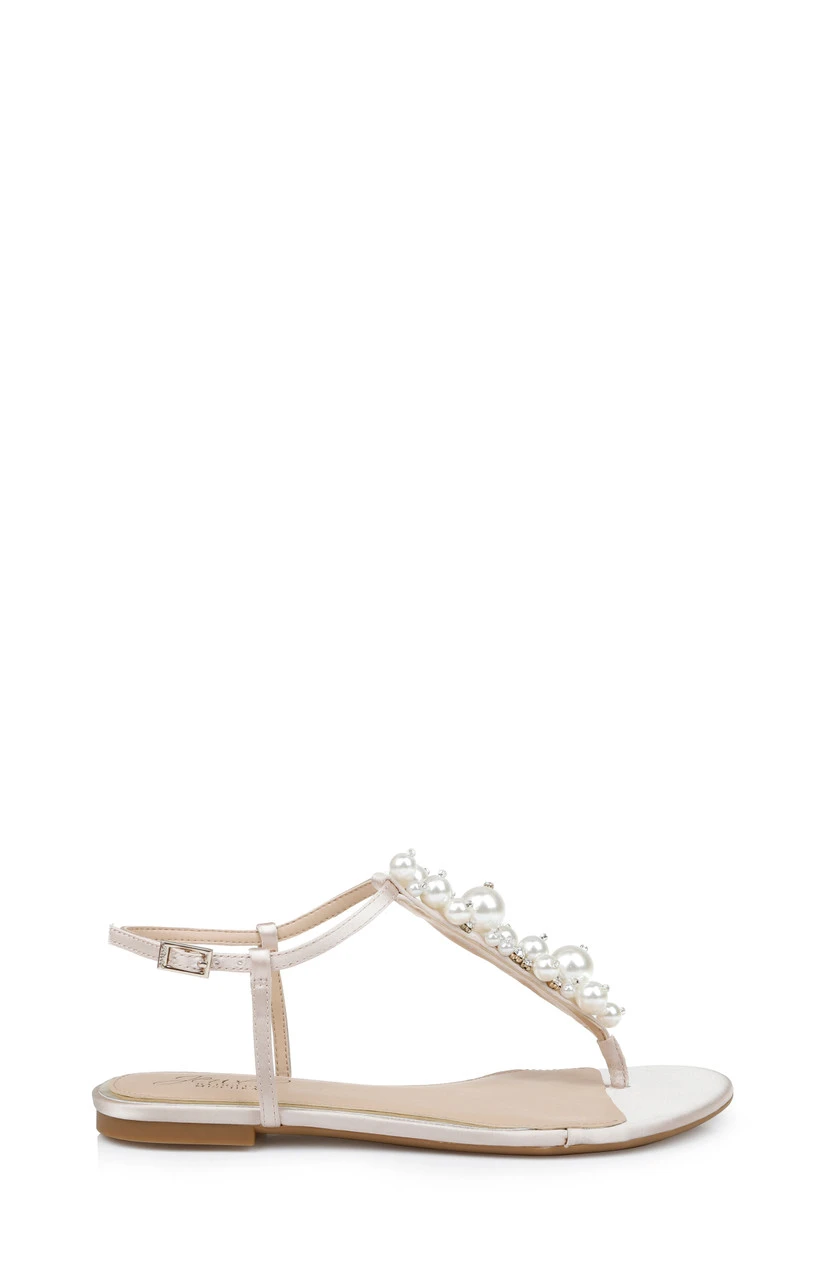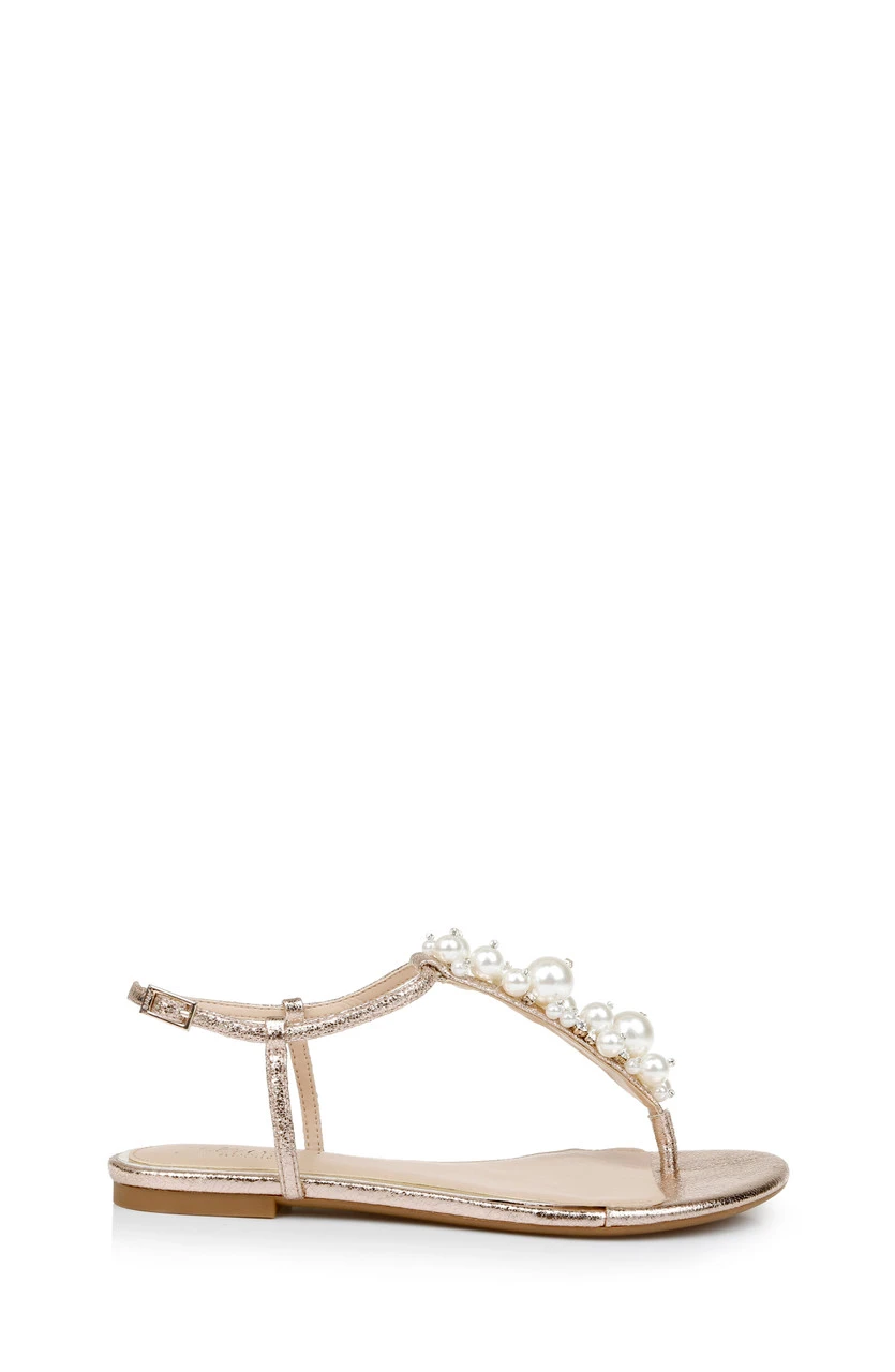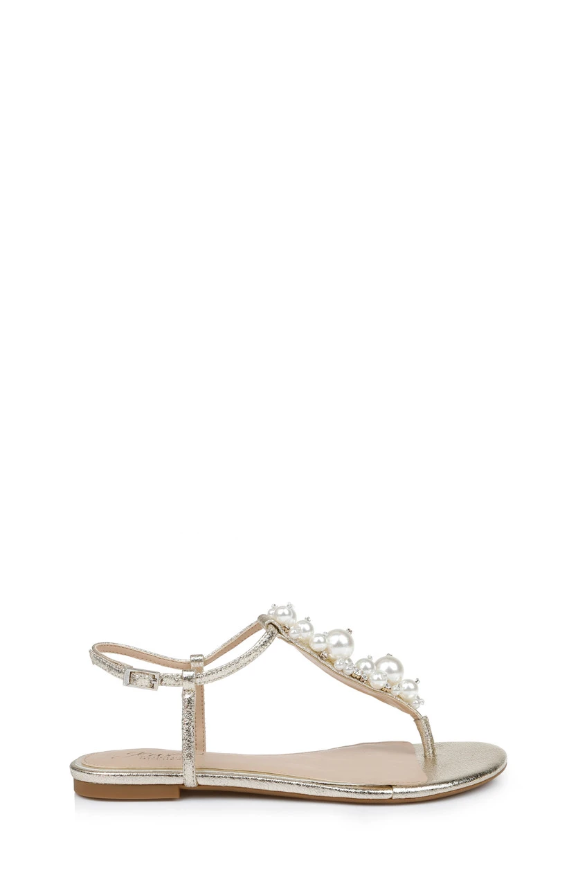 Crystal and pearls creatively adorn this look, showcasing freedom in design and a carefree spirit. See Lassie for this look with a stiletto heel, and Laurence for a wedge heel.