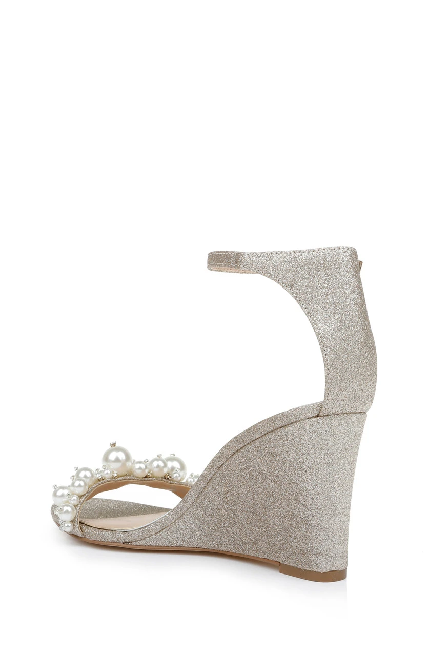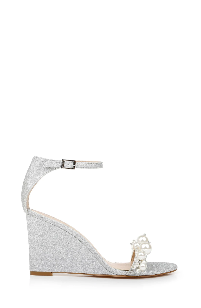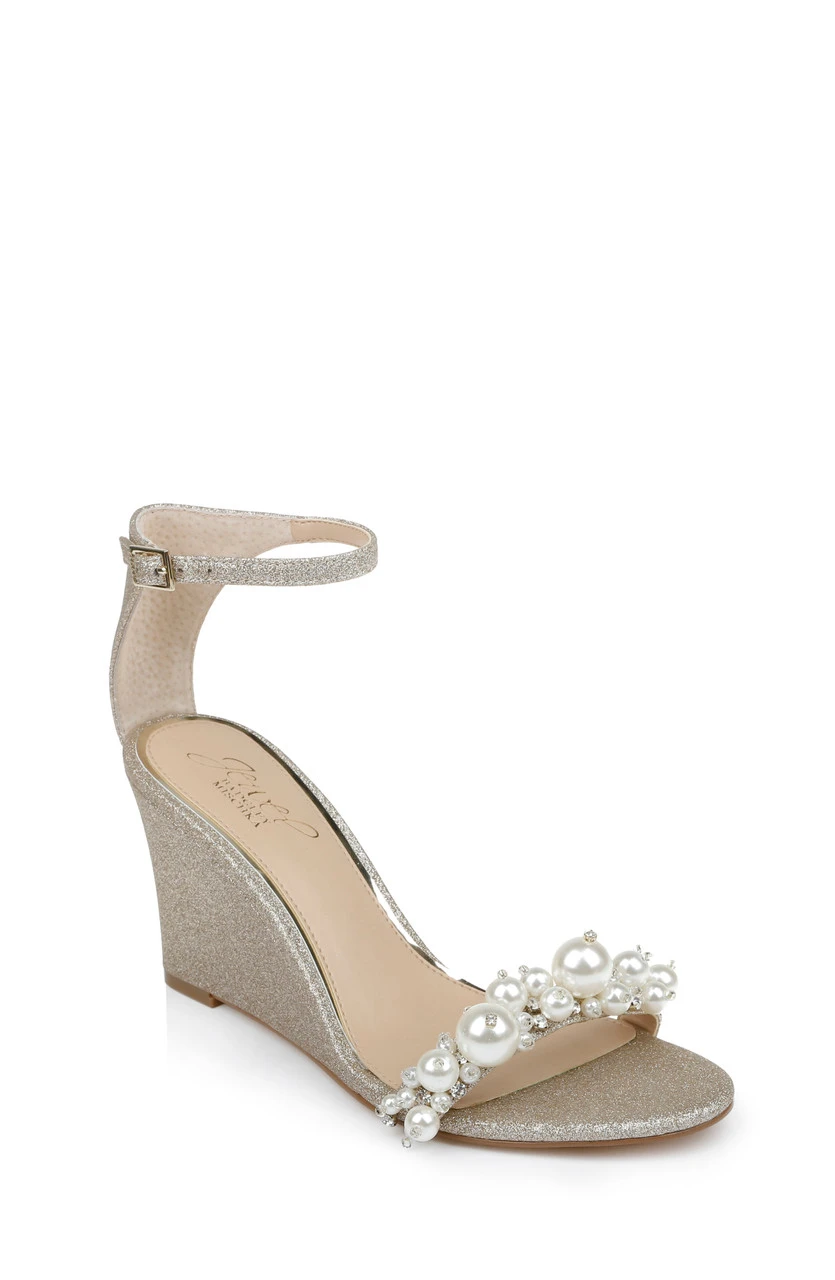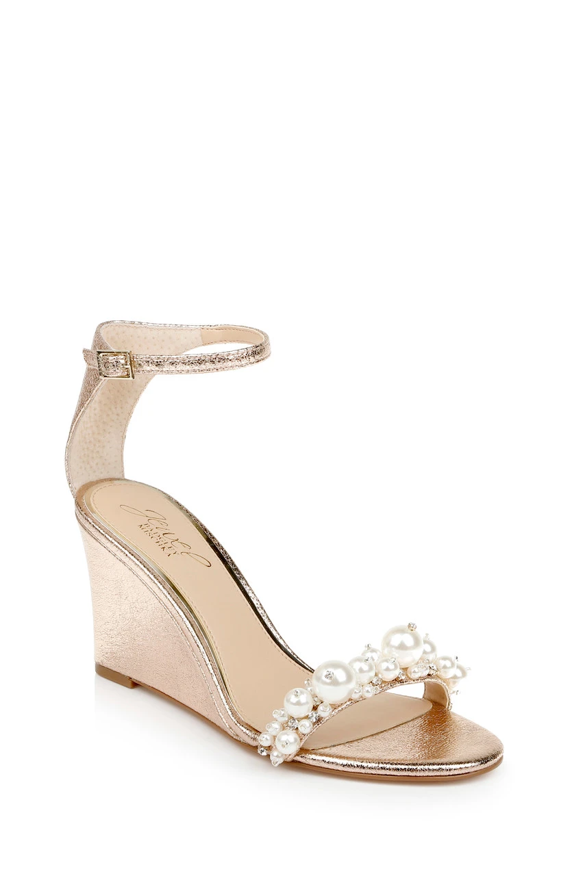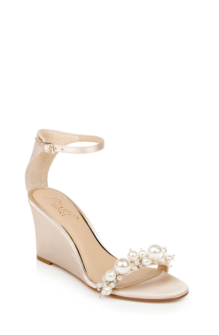 This look combines elegance and creativity, with crystals and pearls of many sizes cascading across the vamp. See Lassie for this look with a stiletto heel, and Larissa for a flat sandal in this style.