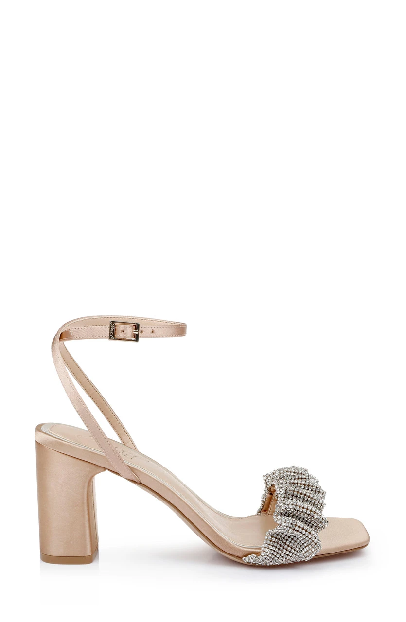 The Rita Bejeweled Strap Block Heel is a bold and stunning style befitting all of your evening needs. Featuring a soft, ruffled strap covered in sparkling rhinestones, this ultra-feminine style is perfect for pairing with your favorite BM evening gown or cocktail dress. An adjustable ankle strap adds additional comfort and style to complete the look, resulting in a glamorous silhouette that is sure to make you feel like a true diva!